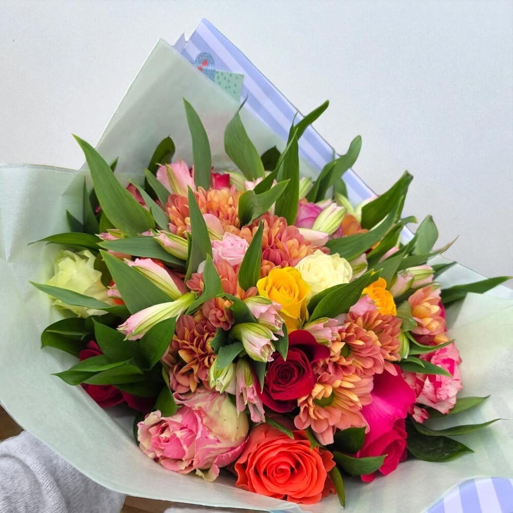 “Dulce Amanecer” es un ramo lleno de luz, ternura y color, que evoca la frescura de una mañana soleada y feliz. Esta vibrante combinación de rosas multicolor, alstroemerias, crisantemos y follaje verde ha sido cuidadosamente dispuesta para transmitir alegría, amor y optimismo. Sus tonos rosados, naranjas, amarillos y blancos iluminan cualquier ambiente y alegran el corazón de quien lo recibe. Su envoltura delicada y moderna lo convierte en el regalo ideal para cumpleaños, agradecimientos o simplemente para decir “te pienso”. Cada flor es una expresión de cariño que florece en un abrazo. Perfecto para quienes aprecian la belleza natural y la armonía de los colores.