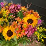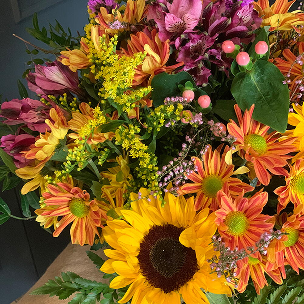 girasol - 2 ud. lentisco - 3 ud. helecho - 2 ud. limonium morado - 3 ud. solidalgo - 3 ud. hypericum rosa - 2 ud. margarita naranja bicolor - 5 ud. astromelia fucsia - 3 ud.