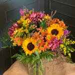 Embellezca su hogar o ilumine los días de sus seres queridos con este artístico arreglo floral De Autor. Cuidadosamente compuesto por dos radiantes Girasoles, cinco Margaritas en un atractivo tono naranja bicolor, dos ramitas de Hipericum rosa, tres Astromelias Fucsia y tres Solidagos. Un toque de encanto adicional se aporta con tres Limonium Morado y tres ramos de Lentisco. Este maravilloso ramo se completa con dos piezas de helecho para asegurar una sensación de frescura. Cada elemento ha sido elegido por su belleza única y combinados para crear una presentación impresionante que embellecerá cualquier mesa.