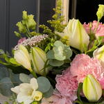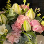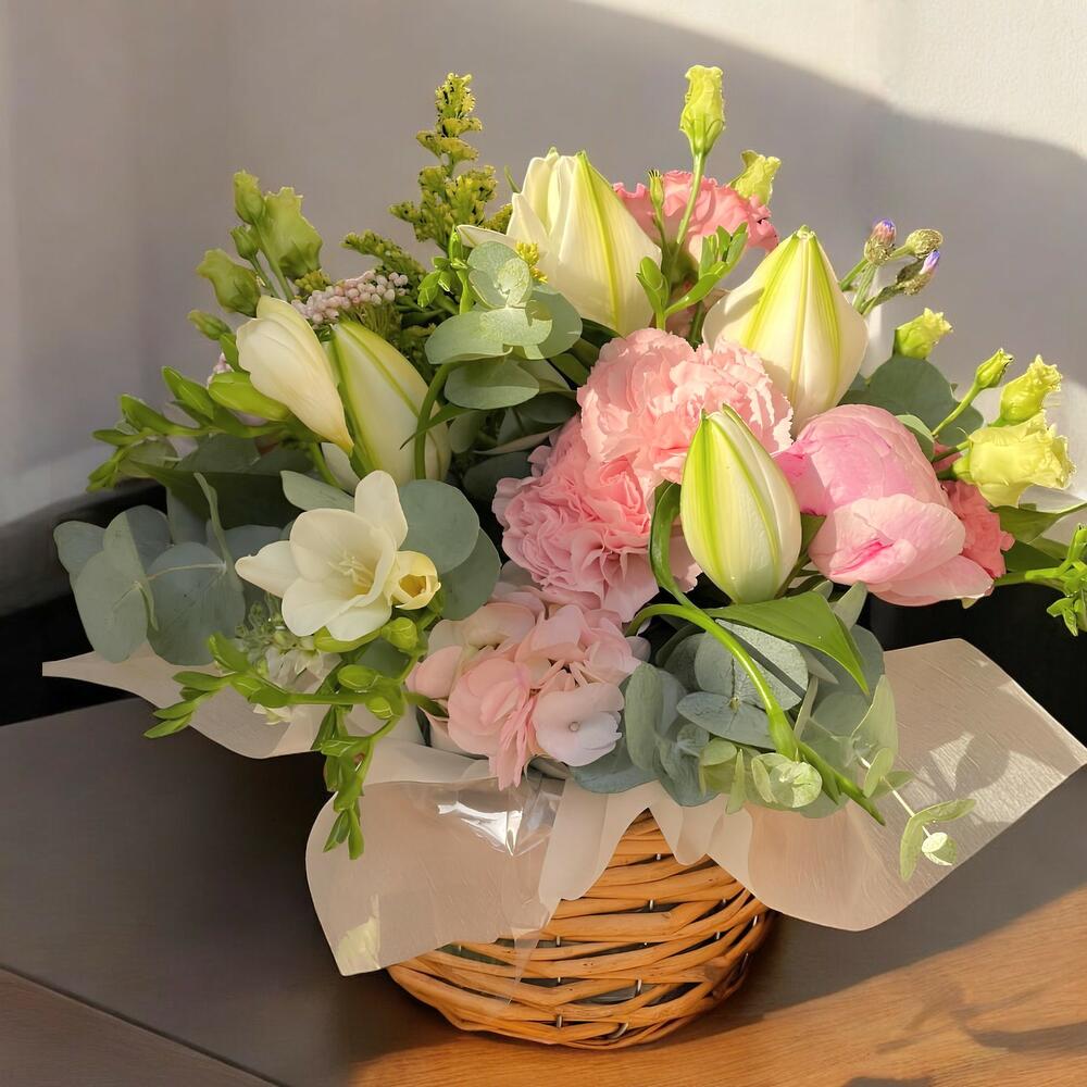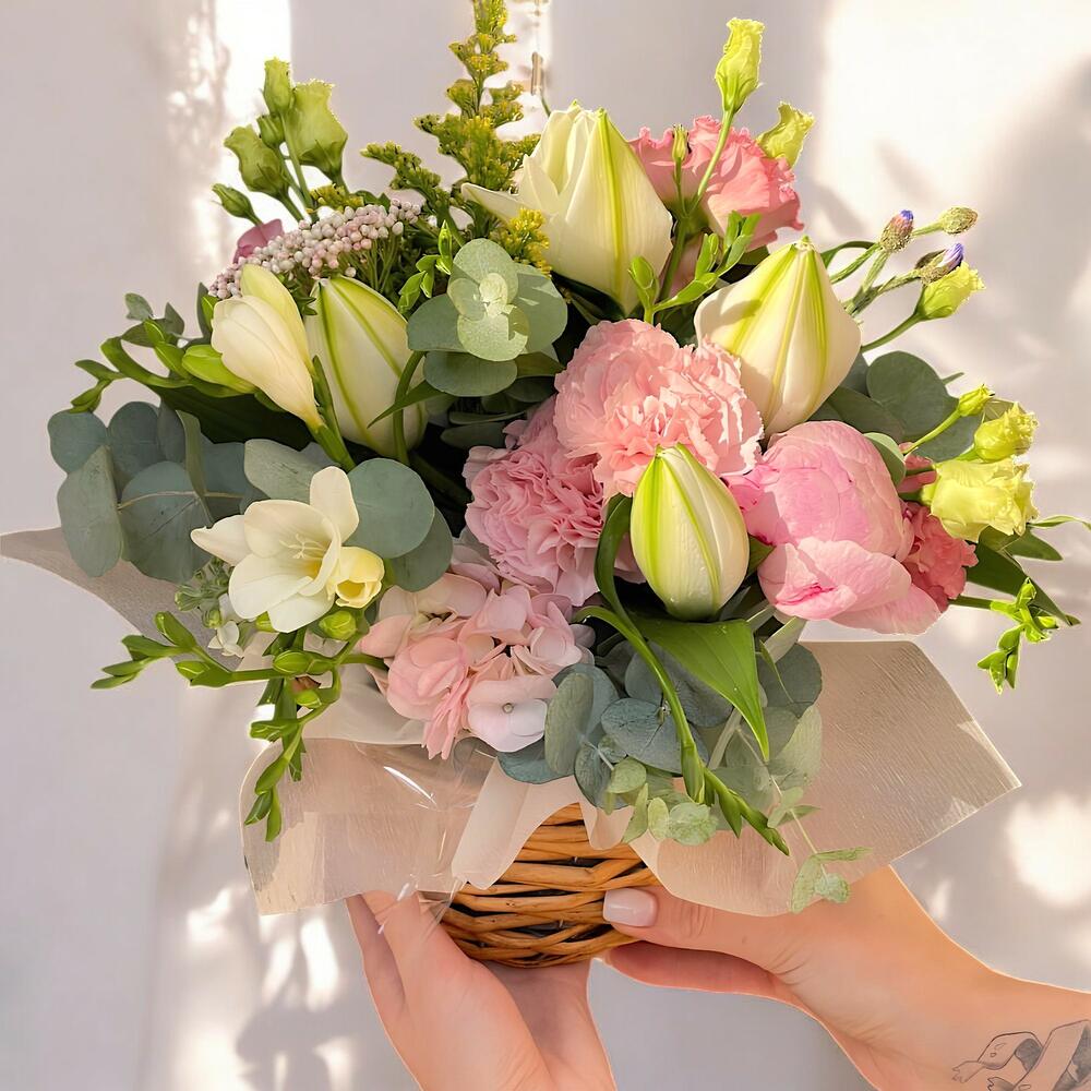 Una delicada cesta de flores en tonos pastel diseñada para transmitir elegancia y dulzura. Esta composición combina la frescura de los lirios blancos con la suavidad de las peonías y claveles rosados, acentuada por las fresias y eustomas que aportan un toque de ligereza. El follaje de eucalipto y las ramas de solidago completan el arreglo, creando un contraste natural. Perfecto para ocasiones especiales como aniversarios, cumpleaños o simplemente para alegrar un día.