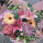 Ramo en tonos rosas con flor variada. La composición de flor varia según estación y disponibilidad