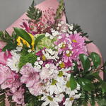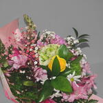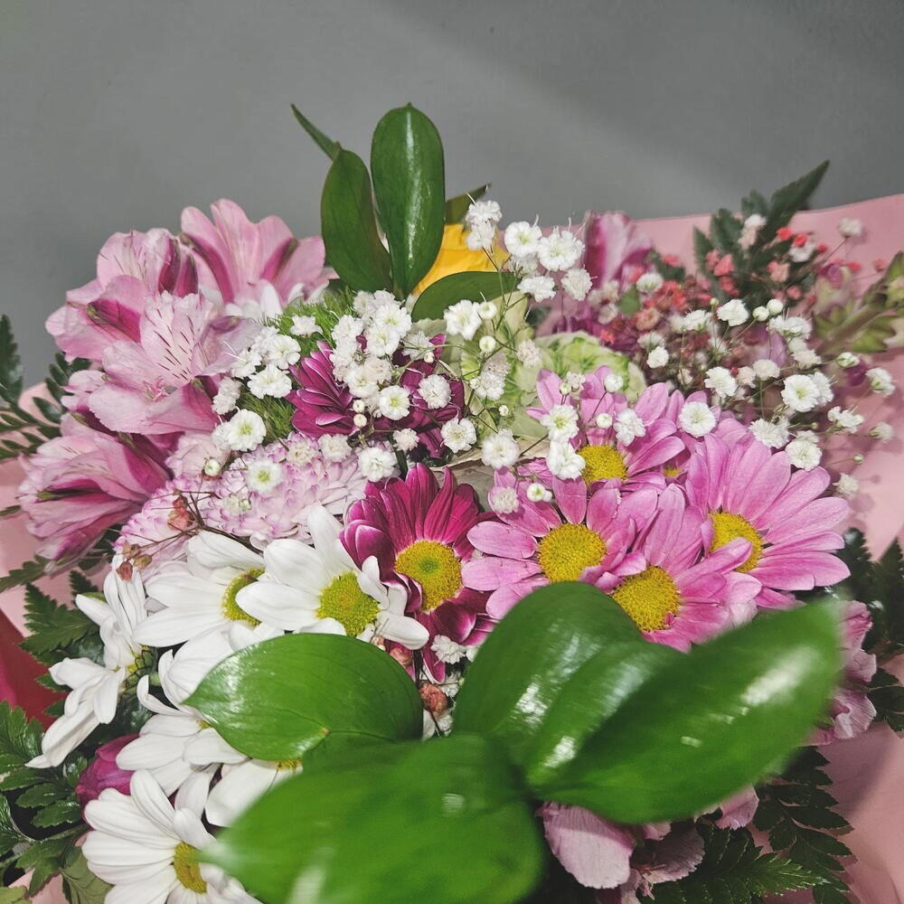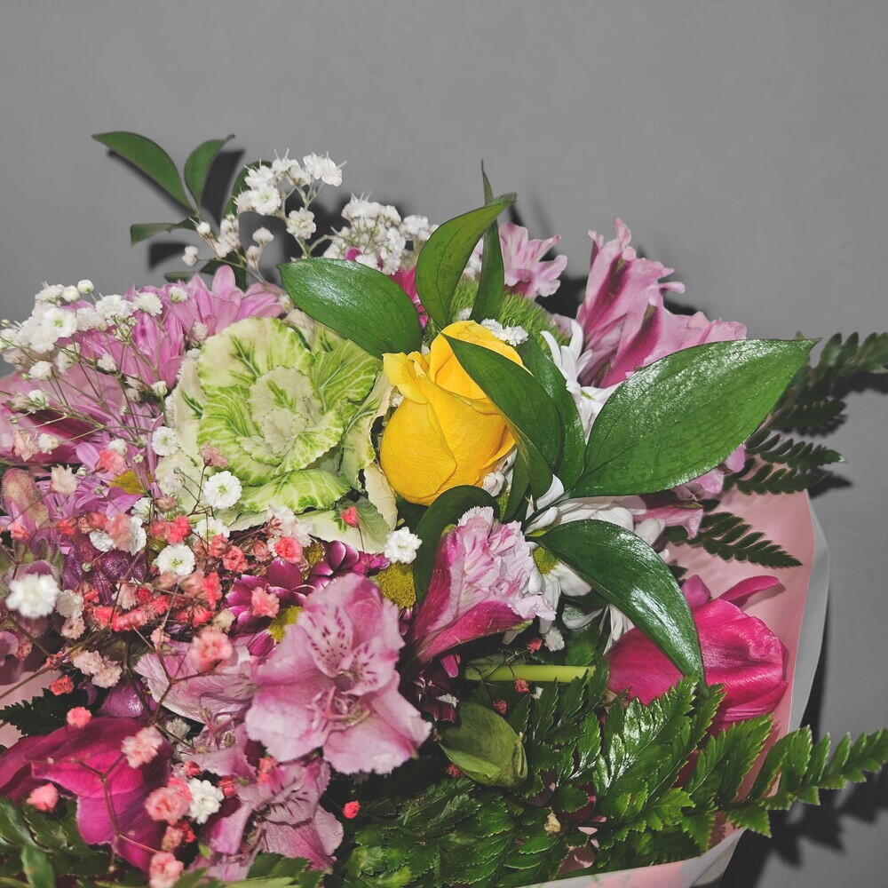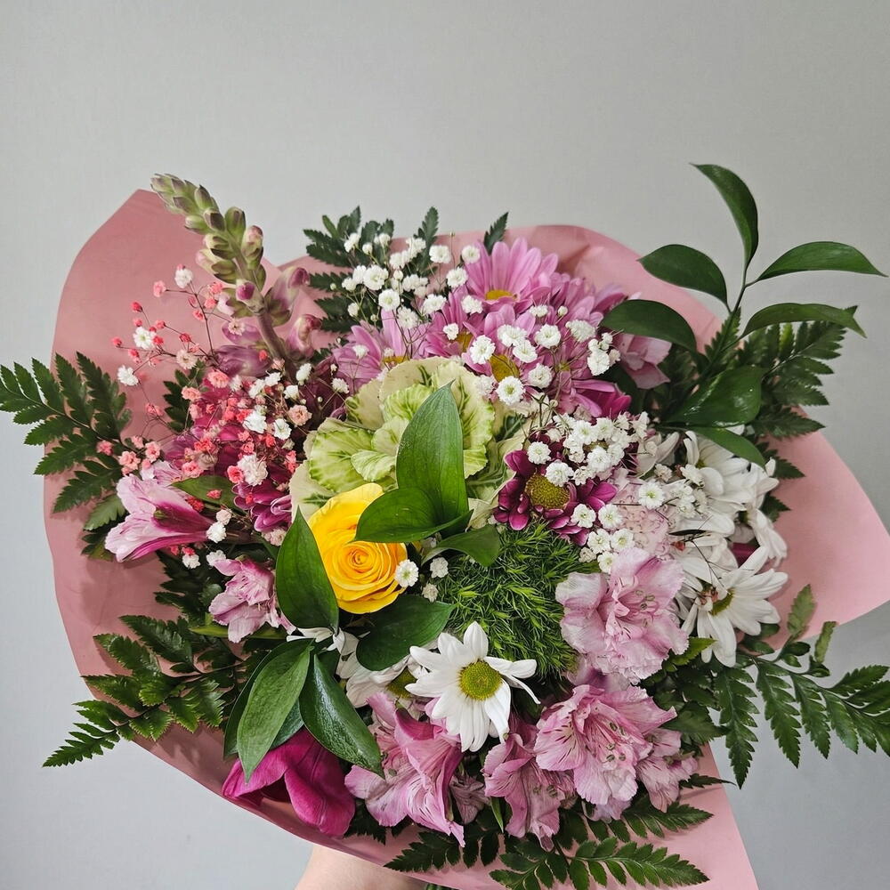 Un delicado y alegre bouquet que combina tonos rosados, blancos y verdes, creando una composición fresca y armoniosa. La presencia de una rosa amarilla en el centro aporta un toque luminoso que simboliza amistad y felicidad. Este arreglo destaca por su mezcla de texturas y flores variadas, logrando un estilo natural y elegante. Es perfecto para regalar en cumpleaños, Día de la Madre, aniversarios o para expresar cariño y buenos deseos. Su envoltura en papel decorativo resalta la suavidad y romanticismo del conjunto. Cada detalle está cuidadosamente seleccionado para transmitir frescura y vitalidad. Para su cuidado, se recomienda cortar los tallos en diagonal, cambiar el agua cada 1–2 días y mantener el bouquet en un lugar fresco, lejos del sol directo y fuentes de calor.