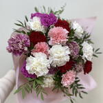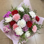 Immerse yourself in the enchantment of simplicity with this Mono Bouquet. Comprised of 4 intricate pieces of follaje, this make-up of greens adds a touch of nature to any setting. Intertwined in the composition are 20 beautifully assorted claveles, creating a colorful spectacle for the eyes. The ensemble is delicately wrapped in 1 piece of decorative papel envoltorio, crafting a floral masterpiece that effortlessly beams grace and elegance. Capture the essence of beauty with this Mono Bouquet.