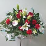 Este vibrante arreglo combina la pasión del rojo con la pureza del blanco, creando una composición elegante y llena de energía. Las rosas rojas aportan un toque romántico, mientras que los lirios blancos añaden sofisticación y frescura. Los claveles rojos iluminan el ramo con su textura suave, y el eucalipto aromático completa el conjunto con un aire natural y armonioso. Ideal para ocasiones especiales, celebraciones o como un mensaje de amor que no necesita palabras. Para mantener su belleza por más tiempo, coloca el ramo en un jarrón con agua fresca, cambia el agua cada 1–2 días y recorta ligeramente los tallos en diagonal. Evita la luz solar directa y las corrientes de aire para que las flores conserven su frescura y perfume.