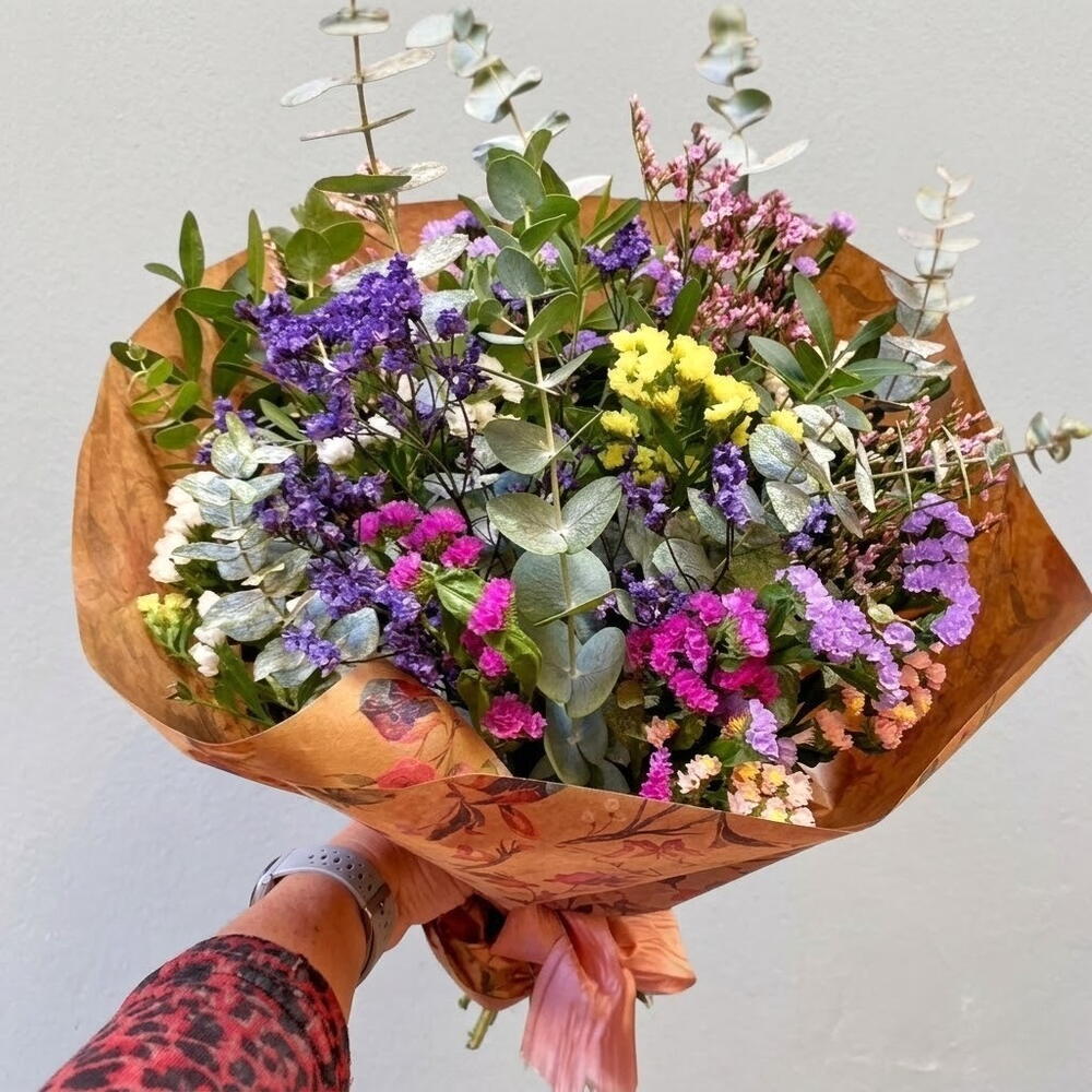 Un bouquet fresco y lleno de color que combina delicadas flores de temporada con elegantes toques de follaje natural. La mezcla de statice en tonos morados, limonium, pequeñas flores silvestres y eucalipto crea una composición ligera, natural y muy armoniosa. Sus colores vivos en amarillo, lila, rosa y blanco aportan alegría y un estilo campestre muy elegante. El eucalipto añade textura y un suave aroma que realza la frescura del ramo. Este bouquet es perfecto para sorprender con un detalle natural y lleno de vida, ideal para cumpleaños, agradecimientos o simplemente para alegrar cualquier día. Su estilo silvestre y desenfadado transmite naturalidad y frescura. Para conservar el ramo en buen estado durante más tiempo, se recomienda cortar los tallos en diagonal antes de colocarlos en agua fresca. Cambiar el agua cada dos días y retirar las hojas que queden sumergidas ayudará a mantener las flores frescas. También es aconsejable mantener el ramo en un lugar fresco, lejos del sol directo y de fuentes de calor.