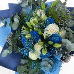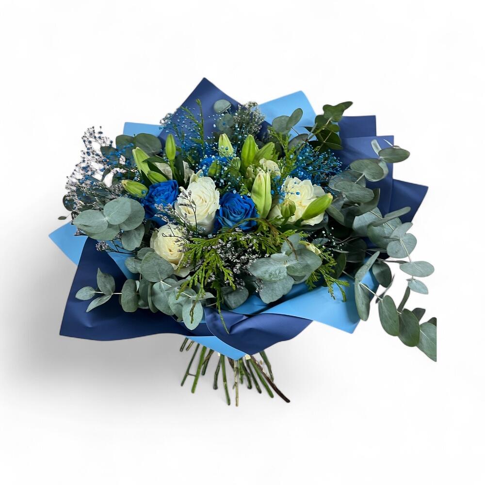 Este producto de la categoría De Autor incorpora una hermosa combinación de flores y plantas seleccionadas meticulosamente para ofrecer un arreglo sorprendente y delicado. Consta de 6 rosas azules y 6 rosas blancas, que representan amor y pureza espectacularmente. También incluye 3 lilium blancos que aportan un aroma agradable y 6 ramas de eucalipto que evocan frescura. La adición de 3 paniculatas azules otorga profundidad y personalidad al conjunto, y las 4 tullas aportan un toque de suavidad inigualable. Finalmente, este conjunto está envuelto en 2 hojas de papel azul, dando un acabado elegante y sofisticado. Anímese a disfrutar de este maravilloso acuerdo floral.