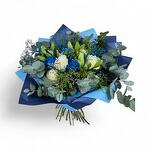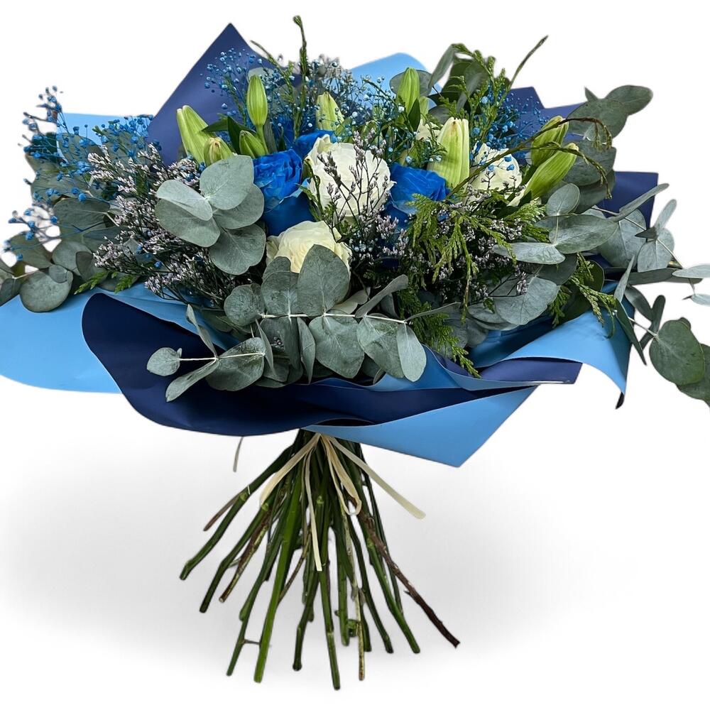 eucalipto - 6 ud. rosa blanca - 6 ud. lilium blanco - 3 ud. paniculata azul - 3 ud. rosa azul - 6 ud. tulla - 4 ud. papel azul - 2 ud.