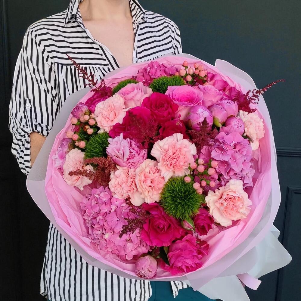 peonía rosa - 5 ud. crisantemo botón verde - 4 ud. clavel rosa claro - 7 ud. astilbe burdeos - 3 ud. hortensia de colombia rosa fucsia - 6 ud. rosa color rosa intenso - 8 ud. hypericum rosado - 4 ud.