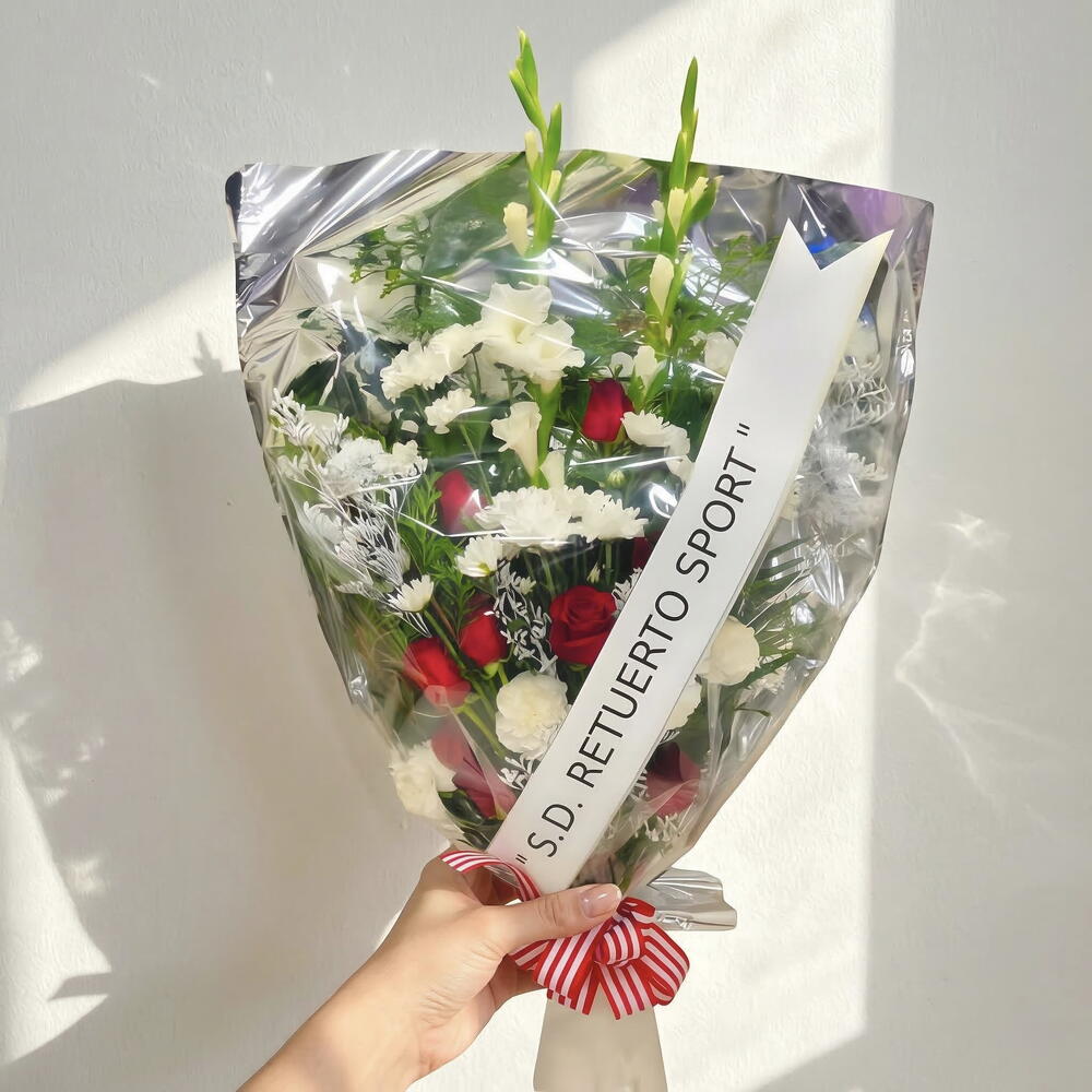 Este elegante ramo funerario está diseñado para expresar respeto y condolencias. Su composición incluye una cuidada selección de flores frescas como margaritas blancas, claveles, rosas rojas y gladiolos, que simbolizan amor, pureza y paz. Complementado con verdes variados y una cinta, este ramo es una forma solemne de acompañar y honrar la memoria de un ser querido. El ramo está envuelto en un elegante papel transparente con un lazo decorativo en tonos sobrios, resaltando la belleza y el respeto del diseño.
