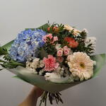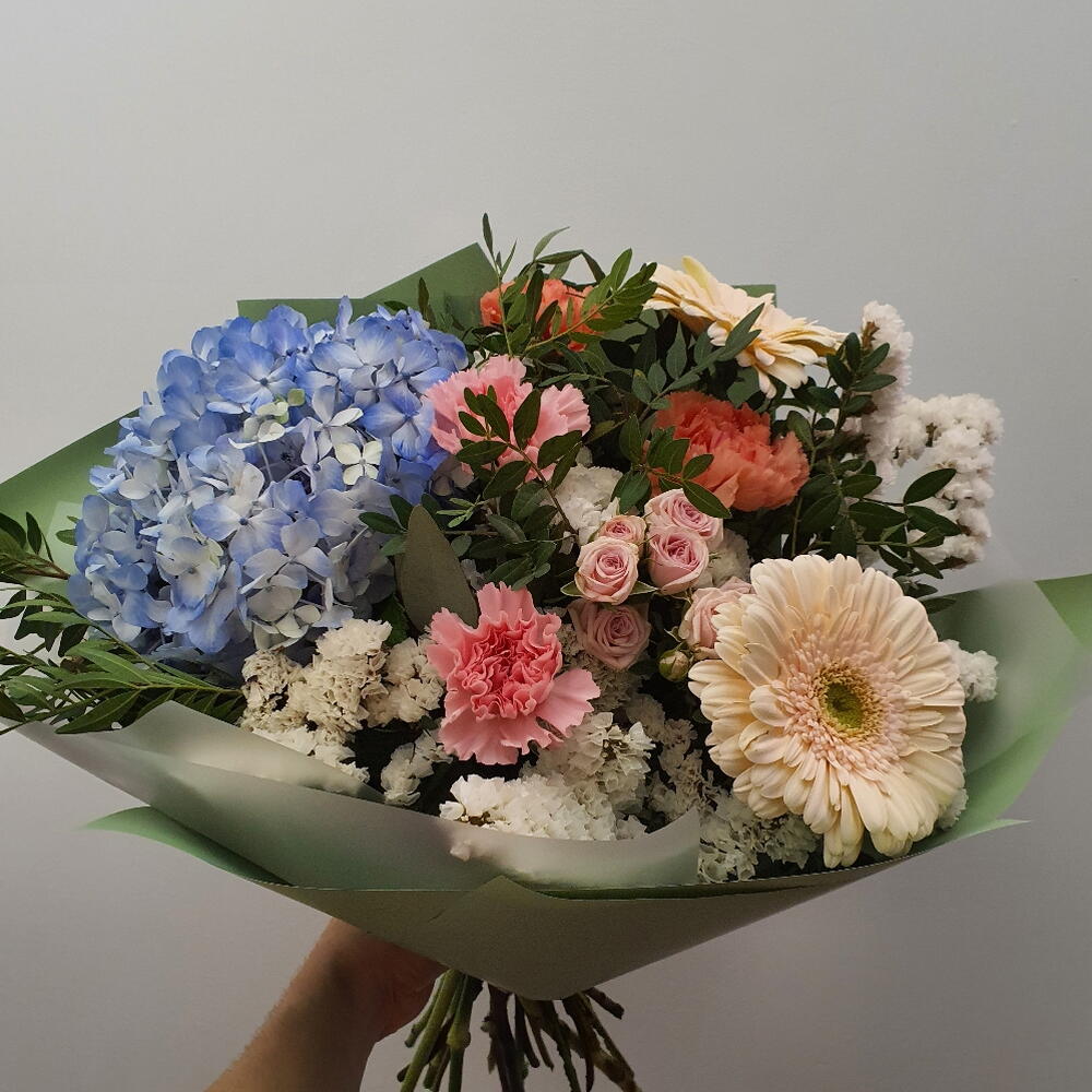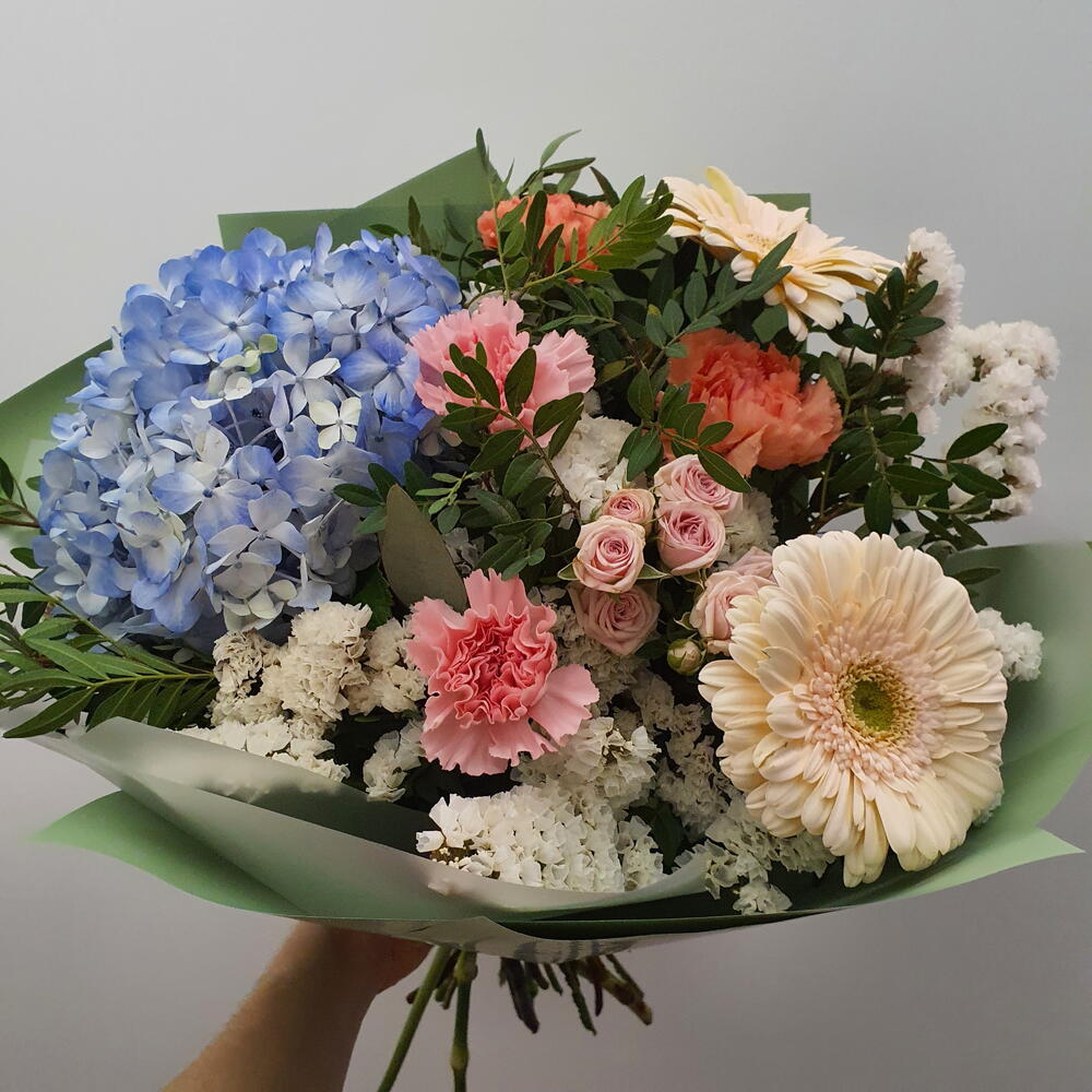 Gerbera - 2 ud. statica - 1 ud. eucalipto - 1 ud. clavel - 4 ud. follaje pistacho - 1 ud. rosa petiminí - 1 ud. hortensia azul claro natural - 1 ud.
