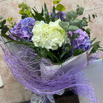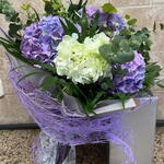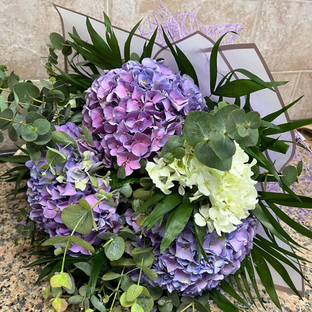 Moderno y romántico ramo de hortensias de colores a elección del cliente y según stock. Decorado con papeles decorativos. Incluye tarjeta de dedicatoria