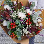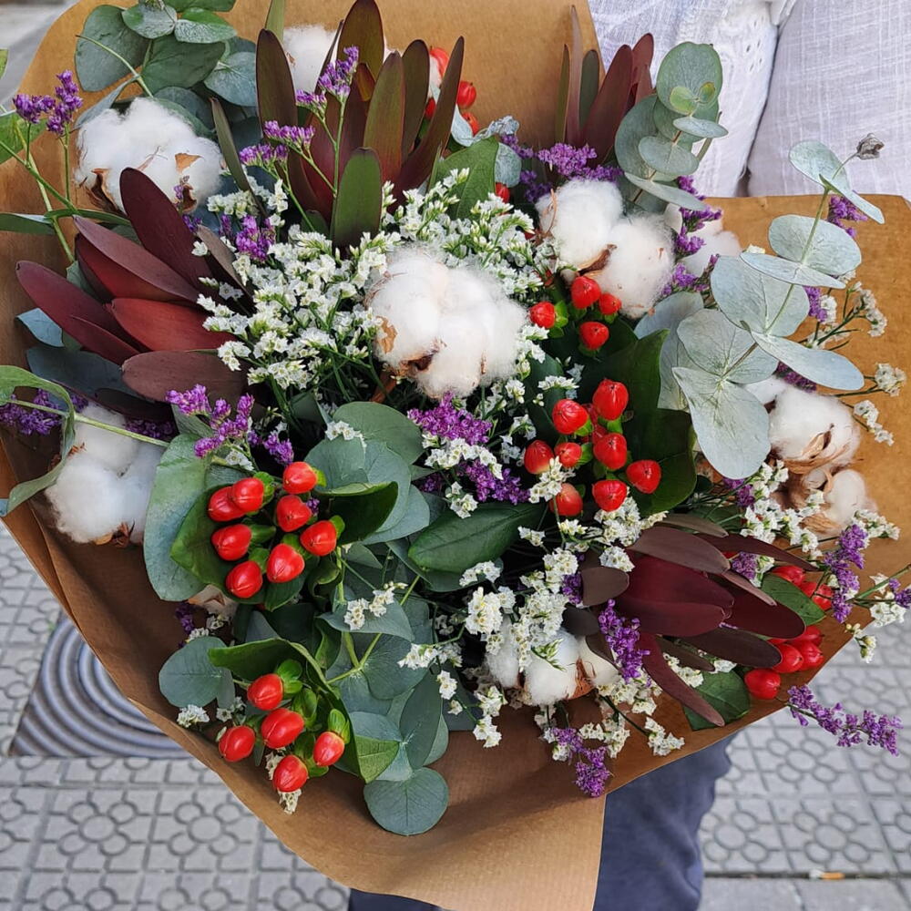hipericum - 4 ud. paquete eucalipto - 1 ud. leucadendro - 4 ud. rama de algodon - 1 ud. paquete limoniun - 1 ud.