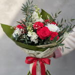 rosa roja - 3 ud. clavel rojo - 5 ud. paniculata blanca - 2 ud. envoltorio decorativo - 1 ud. anastasia blanca - 2 ud. alelí blanco - 2 ud.