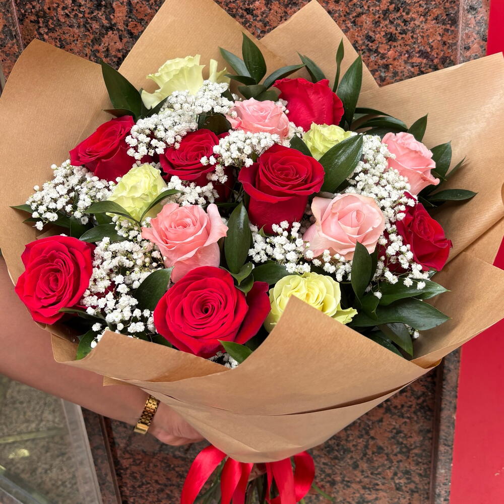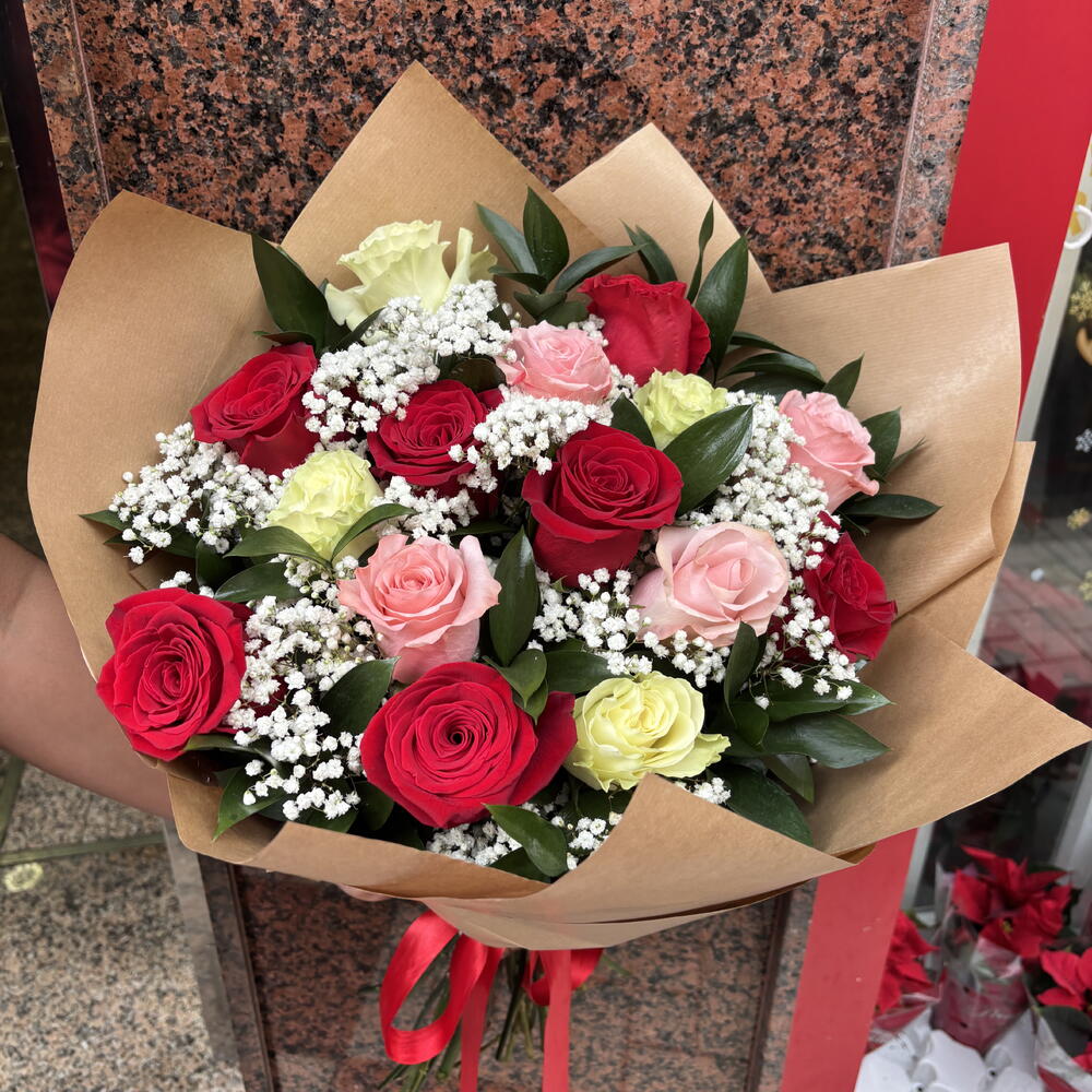 Ruscus - 1 ud. Gypsophila - 1 ud. rosas mix - 15 ud.