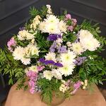 lentisco - 3 ud. estatice morado - 2 ud. estatice rosa - 2 ud. margarita blanca tipo chrysanthemum - 7 ud. estatice blanco - 2 ud.