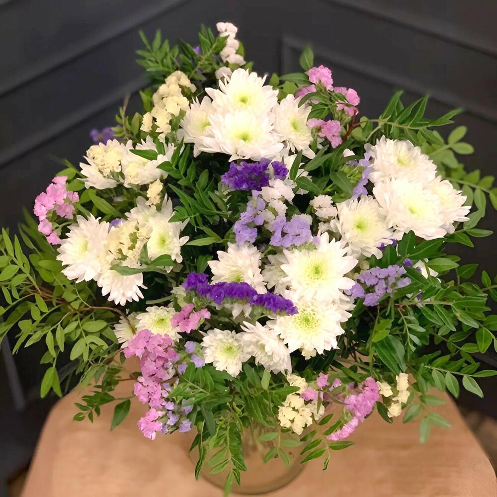 lentisco - 3 ud. estatice morado - 2 ud. estatice rosa - 2 ud. margarita blanca tipo chrysanthemum - 7 ud. estatice blanco - 2 ud.