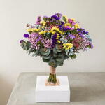 Ramo silvestre y muy original compuesto por una mezcla vibrante de statice multicolor y paniculata en tonos variados, creando una combinación rica en texturas y colores. Los matices en amarillo, lila, rosa y azul aportan un estilo alegre, natural y moderno. El eucalipto añade frescura y volumen, equilibrando la composición con un toque verde elegante. Este tipo de flores, con apariencia ligeramente seca, aporta además una mayor durabilidad y un estilo decorativo muy actual. Perfecto para ella, para una chica, para una amiga o para alguien especial. Ideal en regalo, para cumpleaños, para sorprender, para decorar, para un detalle original o para quienes aman el estilo silvestre y diferente. Una excelente opción si buscas ramo de flores silvestres, bouquet multicolor, flores tipo secas modernas, ramo original y duradero, arreglo floral natural o flores con entrega a domicilio. 🌸✨