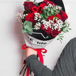 rosas rojas - 10 ud. paniculata blanca - 5 ud. verdes varios - 5 ud. papel coreano - 1 ud. cintas decorativas - 1 ud. pick de corazón decorativo - 1 ud.