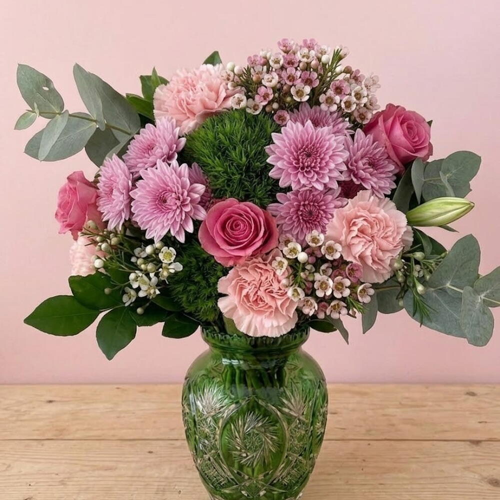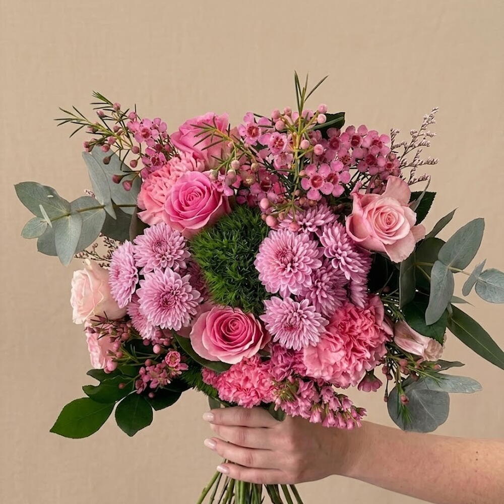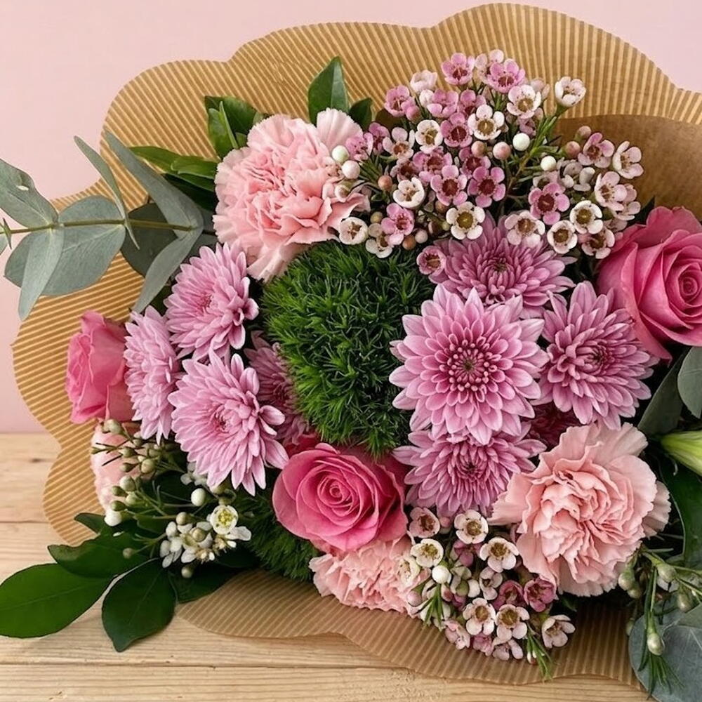 El ramo Mara es elegante y muy dulce Está hecho con flores variadas en tonos rosas y verdes de temporada. (Las flores pueden presentar variaciones en color, tamaño y forma debido a factores naturales y de temporada. La imagen mostrada es ilustrativa; el arreglo final será muy similar pero está sujeto a las flores de cada estación )