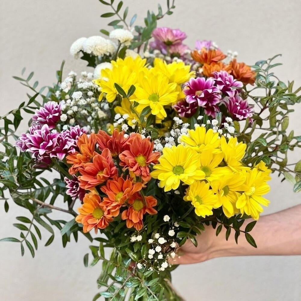 El Ramo de Margaritas de Colores Variados es un arreglo floral lleno de vida y color perfecto para regalar en cualquier ocasión especial. Su diseño fresco y alegre combina margaritas en tonos vibrantes con delicada paniculata blanca y verdes decorativos. Este ramo transmite felicidad y energía positiva. Recomendaciones de cuidado: Para prolongar la frescura de las flores, corta los tallos en diagonal antes de colocarlas en agua limpia. Cambia el agua cada dos días y mantén el ramo en un lugar fresco, lejos de la luz solar directa y corrientes de aire. Si las margaritas o los verdes se marchitan, retíralos del ramo para conservar su aspecto fresco.