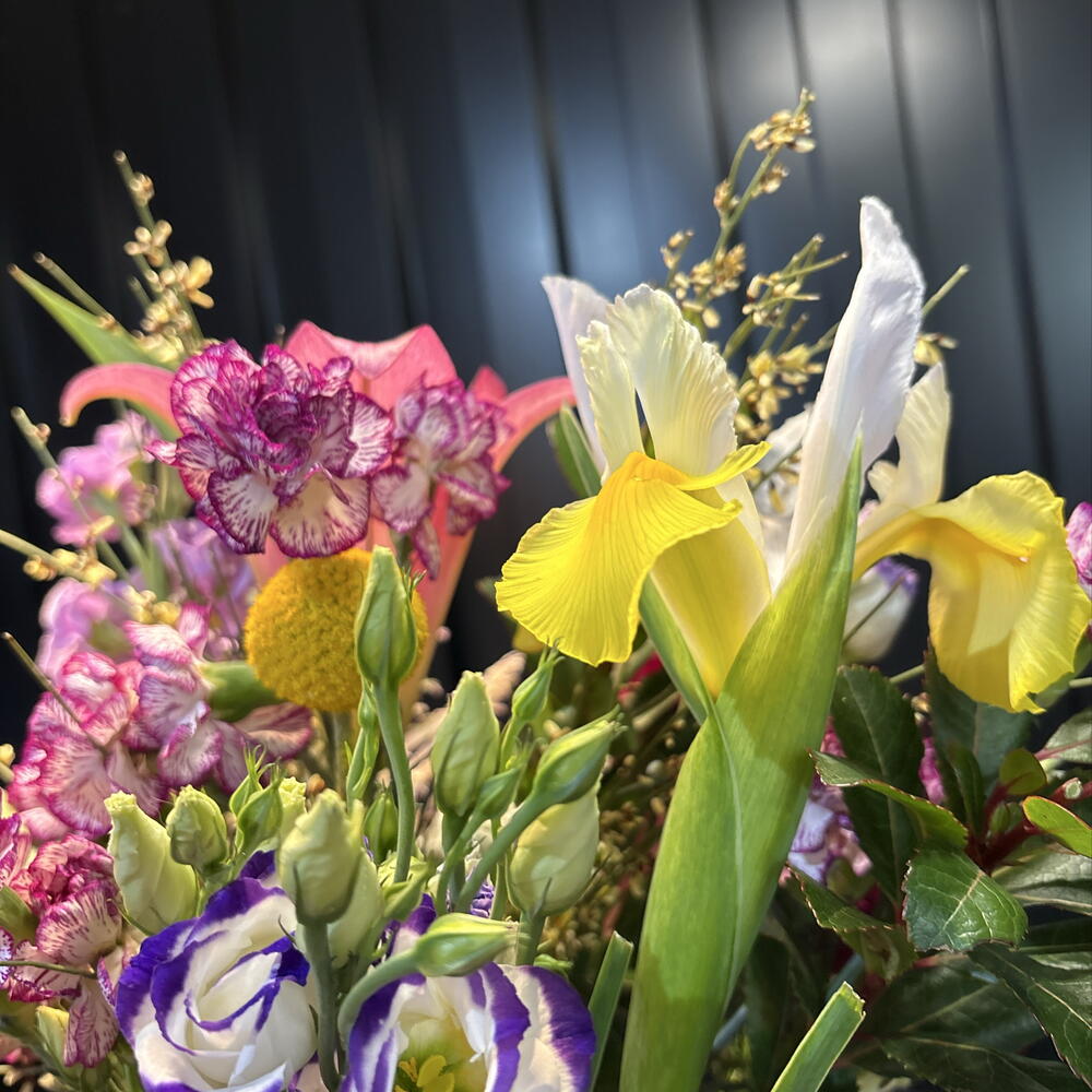 Iris - 1 ud. Lisianthus - 3 ud. Brassica - 1 ud. Lilium - 1 ud. dianthus - 3 ud. fresia - 2 ud. craspedia - 3 ud. clavel - 7 ud. retama - 2 ud. marful - 2 ud. mix de violetas - 1 ud.
