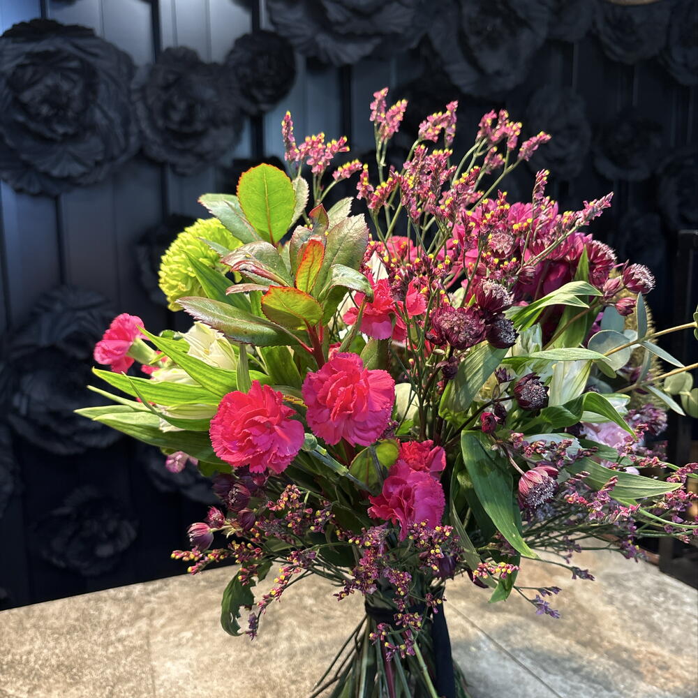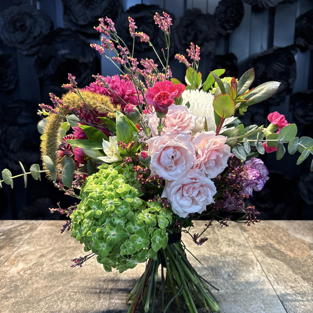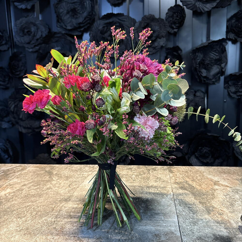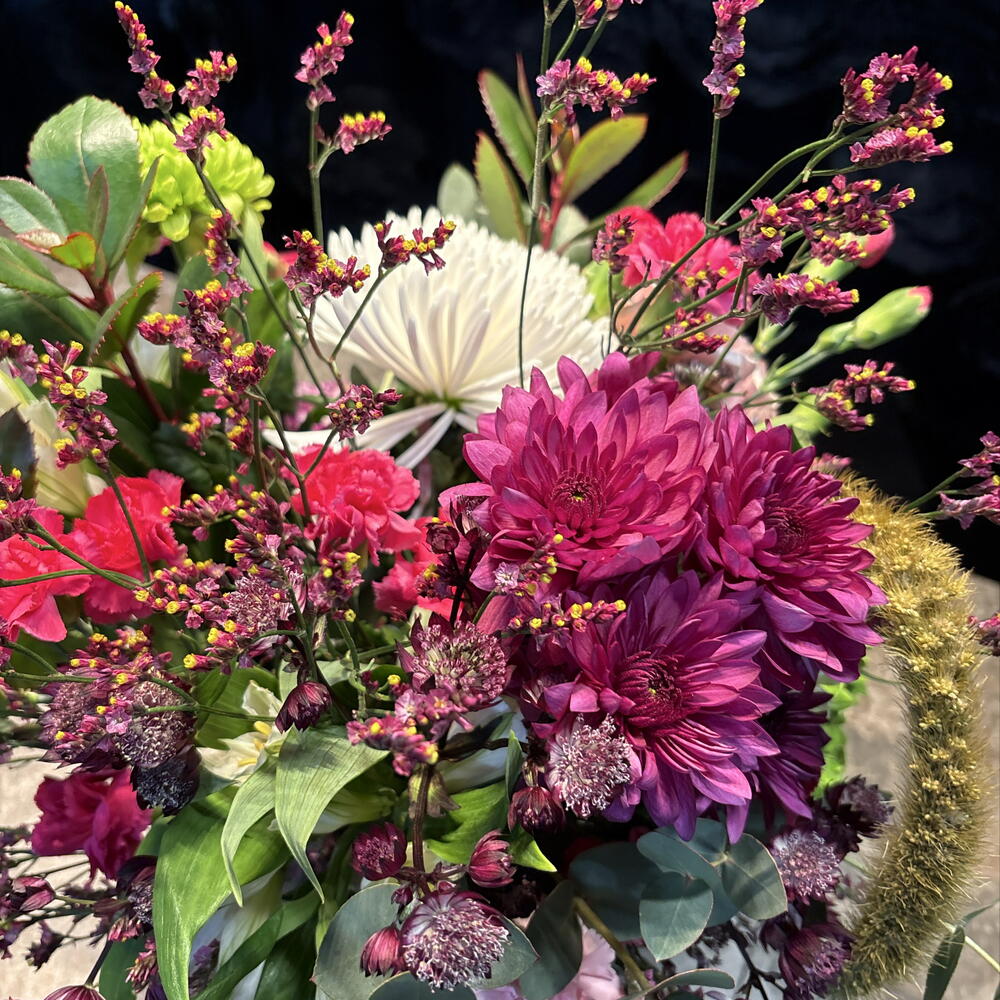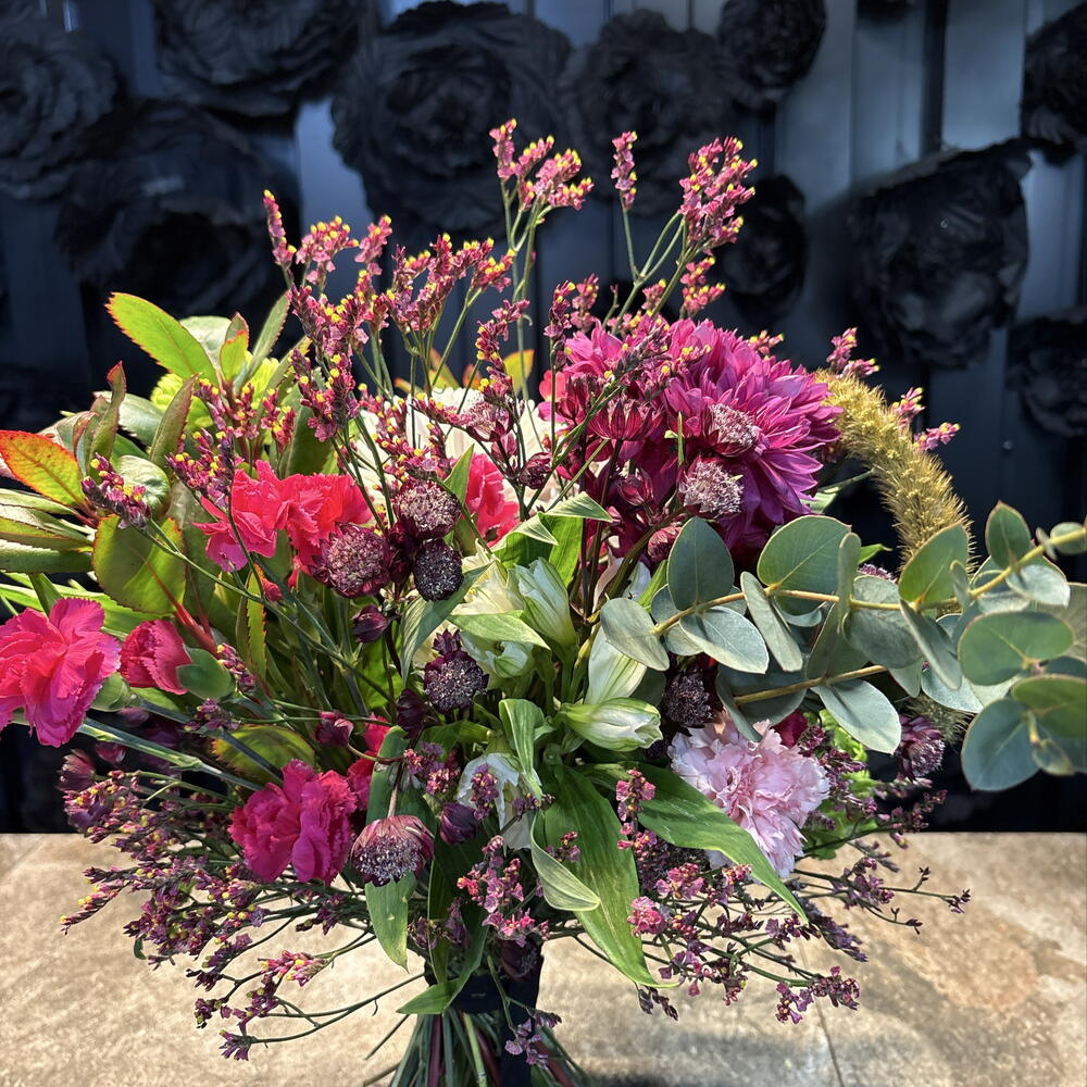 Astrantia - 3 ud. Limonium - 3 ud. Alstroemeria - 3 ud. eucalipto - 1 ud. clavel - 4 ud. rosa ramificada - 1 ud. crisantemos - 3 ud. marful - 1 ud.