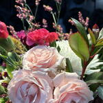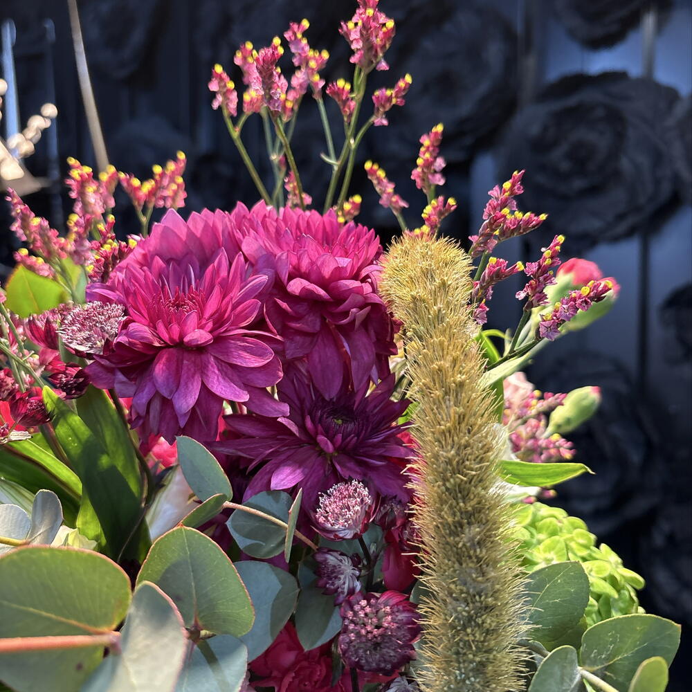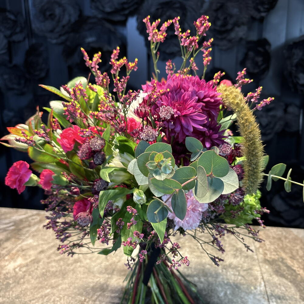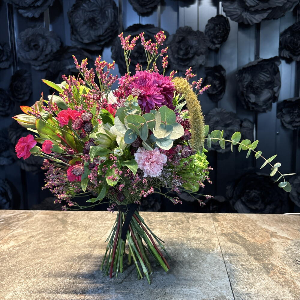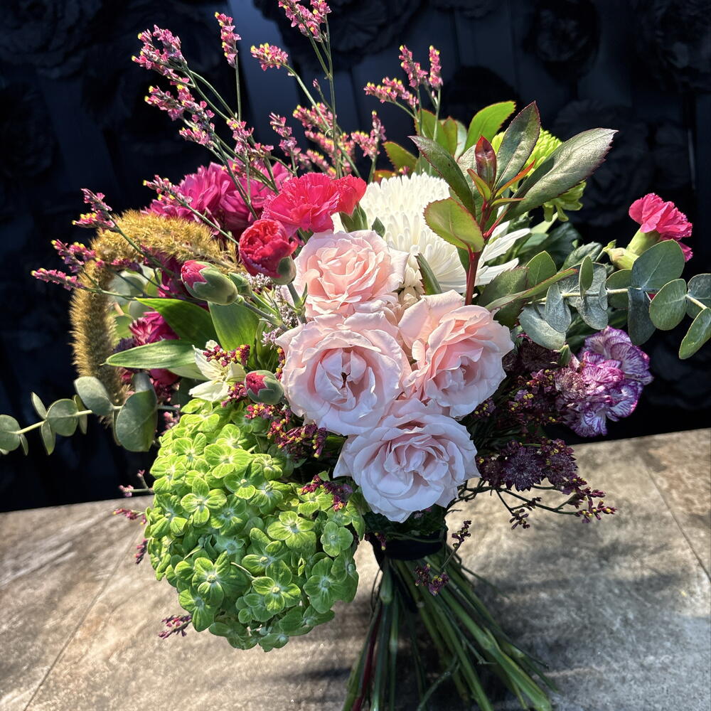 Astrantia - 3 ud. Limonium - 3 ud. hortensia - 1 ud. eucalipto - 1 ud. crisantemo - 3 ud. clavel - 4 ud. rosa ramificada - 1 ud. marful - 1 ud. alstroemeria - 3 ud.