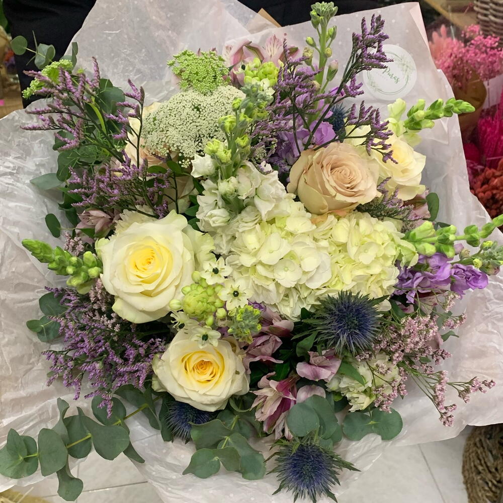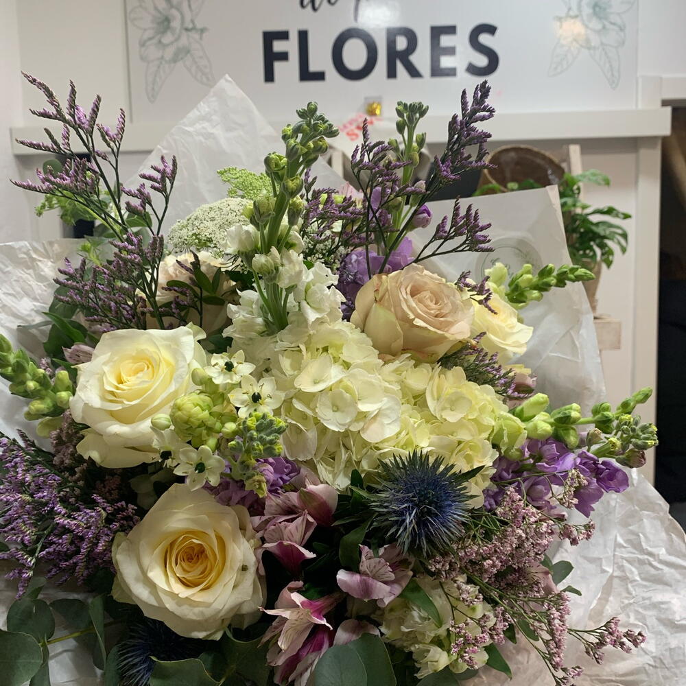 Hermoso ramo en tonos pastel lilas y blancos como tributo a la mujer