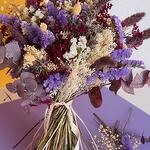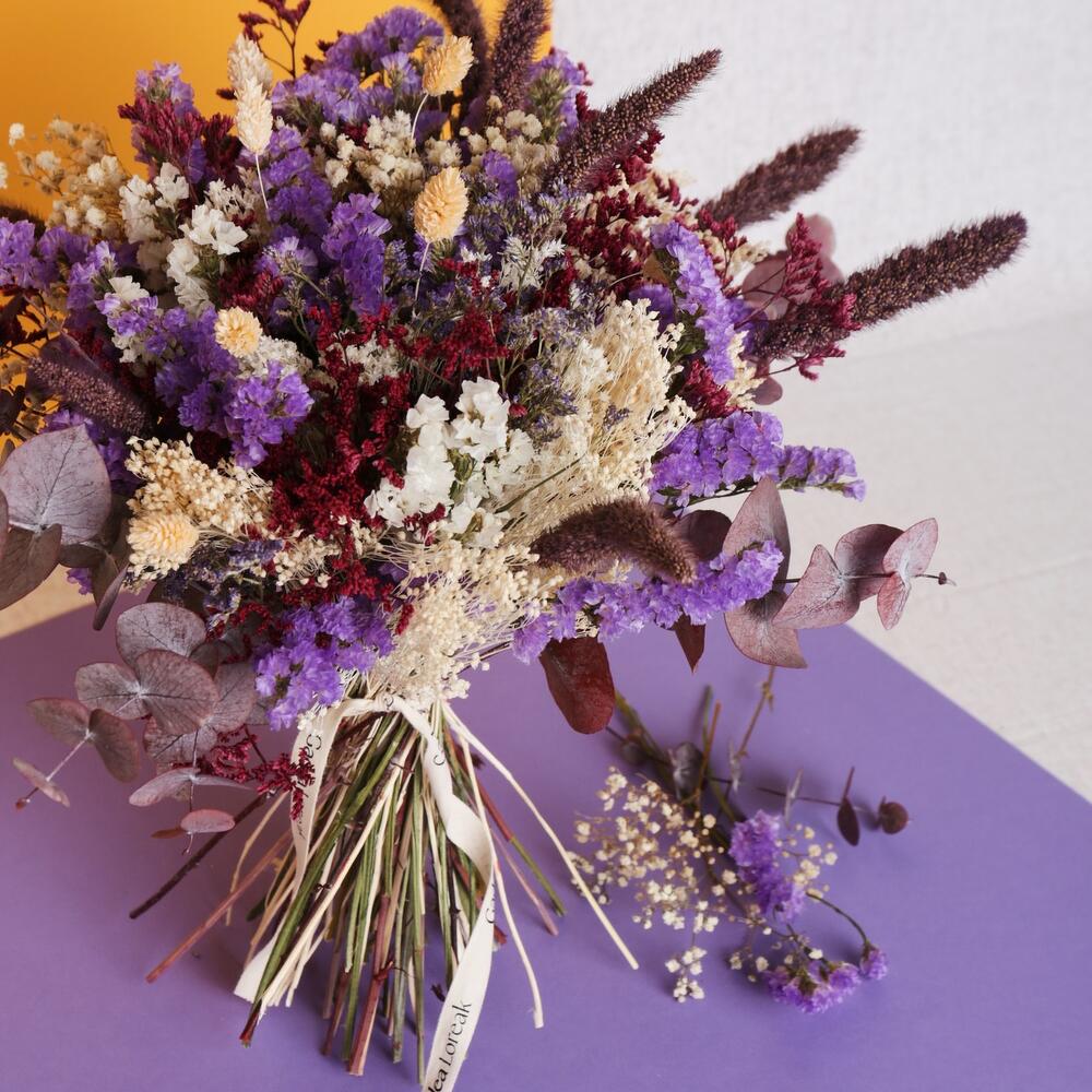 statice blanco - 3 ud. paniculata seca blanca - 4 ud. limonium lila - 6 ud. eucalipto preservado burdeos - 5 ud. setarea burdeos - 5 ud. gramineas secas - 5 ud.