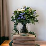 Ramo de flores frescas en tonos blancos, azulado-morado y verdes. Flores : Rosas, Lisianthus, Botón verde, Statice y diferentes variedades de verdes.