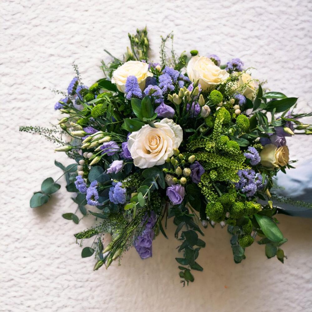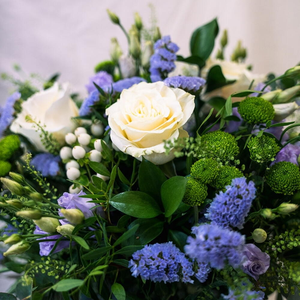 Ramo de flores frescas en tonos blancos, azulado-morado y verdes. Flores : Rosas, Lisianthus, Botón verde, Statice y diferentes variedades de verdes.