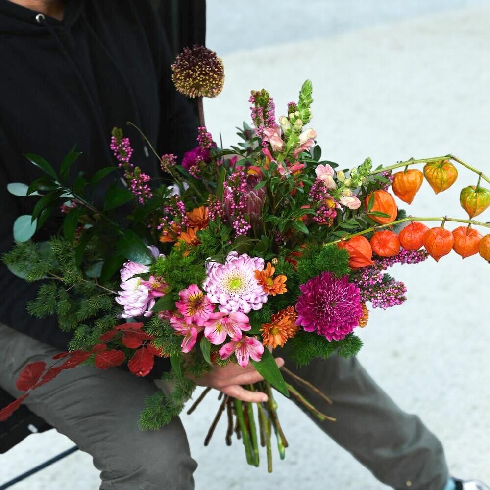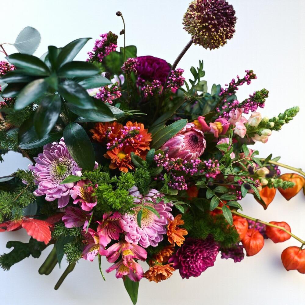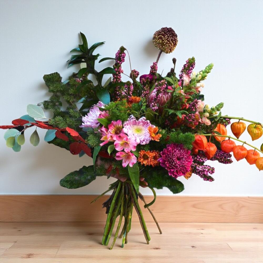 physalis - 3 ud. protea - 1 ud. alstroemeria rosa - 5 ud. eucalipto cinerea - 3 ud. flor de cera rosa - 3 ud. antirrhinum rosa - 2 ud. crisantemo morado - 3 ud. verdes de relleno - 2 ud. crisantemo botón naranja - 2 ud. allium decorativo morado - 2 ud. eucalipto rojo decorativo - 2 ud.
