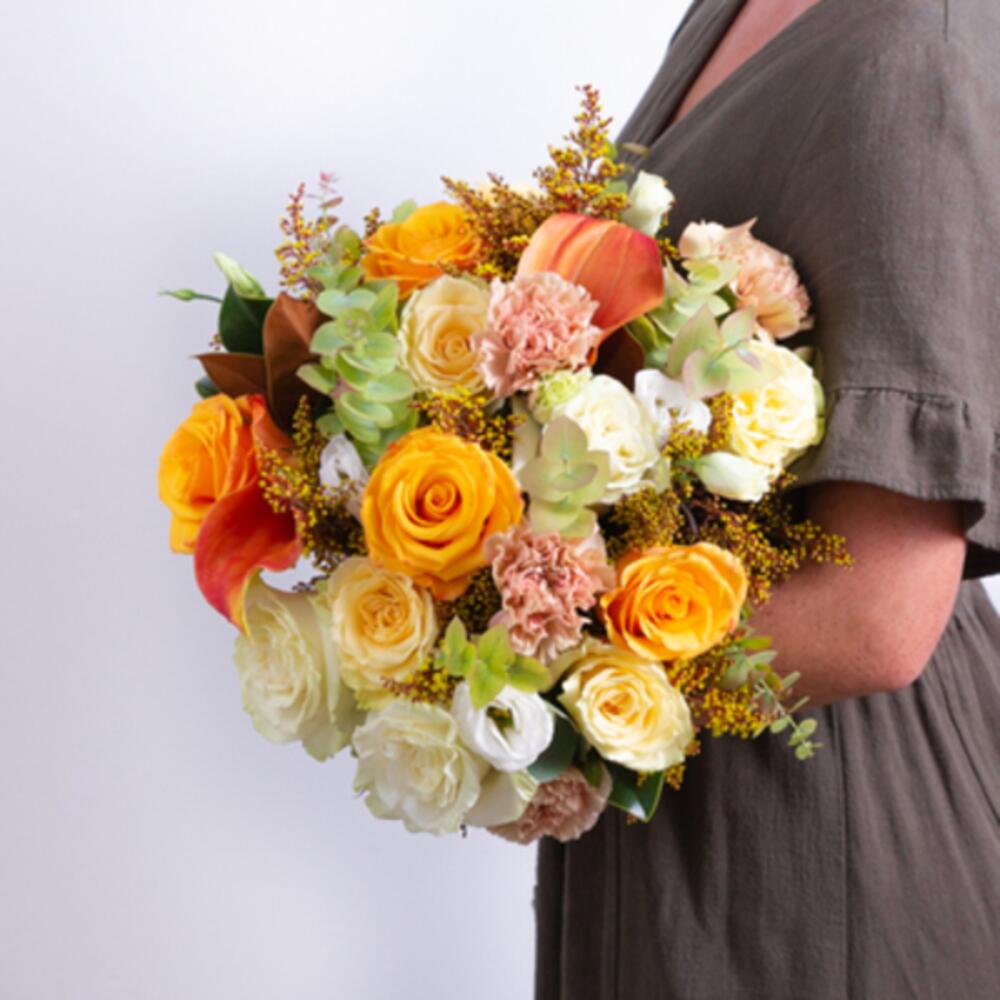 Solidago - 3 ud. lisianthus blanco - 3 ud. rosa amarilla - 5 ud. rosa naranja - 6 ud. calla lily naranja - 3 ud. rosa «mondial» - 4 ud. clavel melocotón - 4 ud.