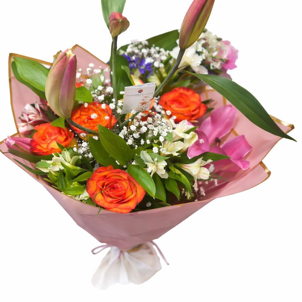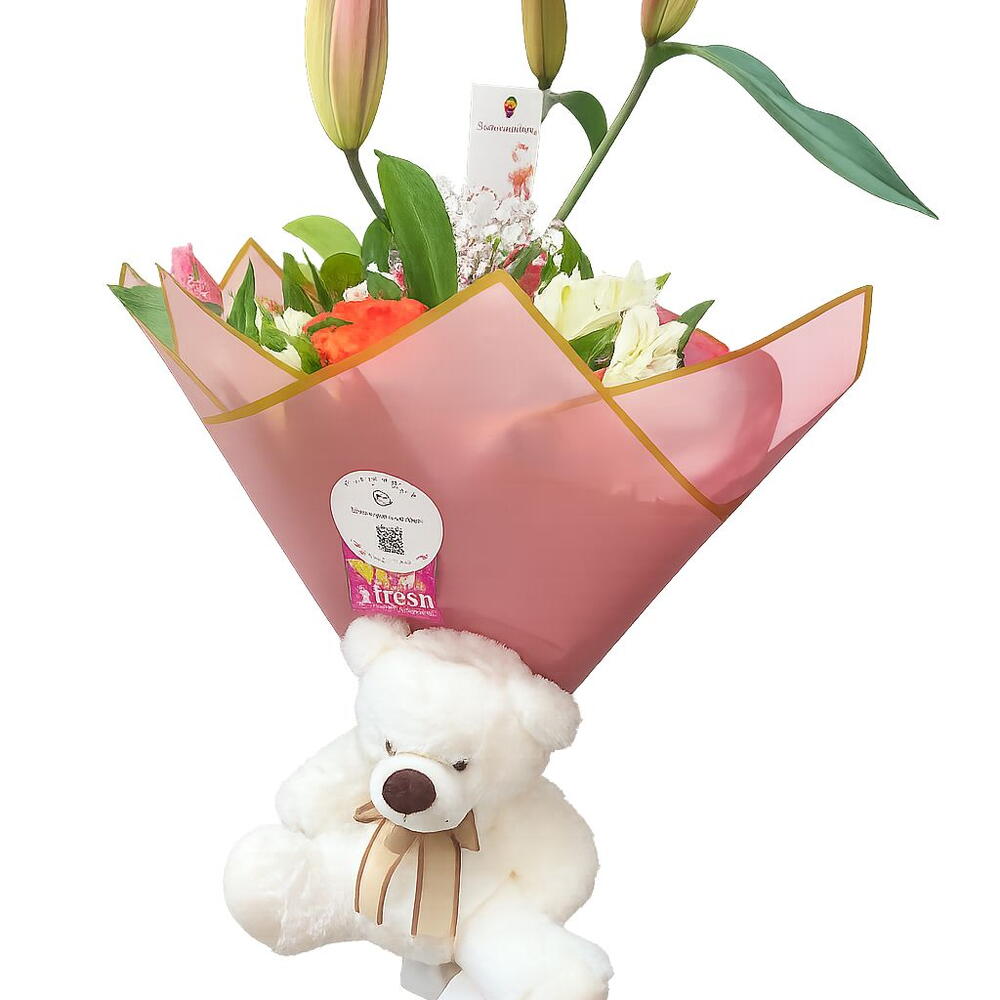 Este precioso arreglo floral de autor incluye 5 majestuosos liliums, 5 sofisticadas rosas y 3 delicadas alstroemerias, complementadas con 3 frescos cortes de paniculata. Para hacer más especial tu regalo, se incluye un adorable osito de peluche y una tarjeta para enviar tu mensaje personalizado. Un obsequio realmente memorable para todas las ocasiones.