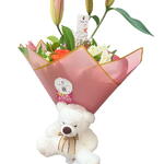 Lilium - 5 ud. alstromerias - 3 ud. rosas - 5 ud. paniculata - 3 ud. tarjeta - 1 ud. osito peluche - 1 ud.