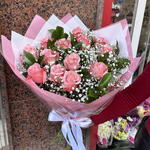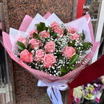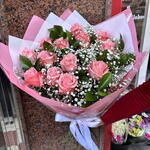 Ruscus - 1 ud. Gypsophila - 1 ud. rosas rosadas - 13 ud.