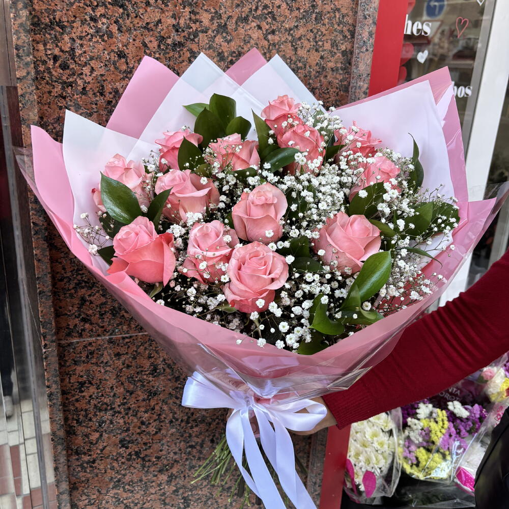Ruscus - 1 ud. Gypsophila - 1 ud. rosas rosadas - 13 ud.