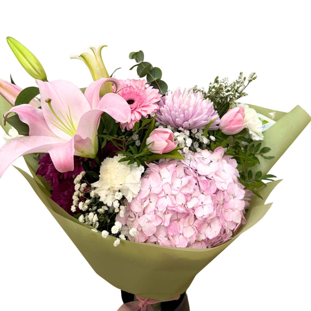 Limonium - 1 ud. hortensia - 1 ud. Gerbera - 1 ud. eucalipto - 1 ud. paniculata - 1 ud. claveles - 2 ud. lentisco - 1 ud. crisantemos - 3 ud. lirio oriental - 1 ud.