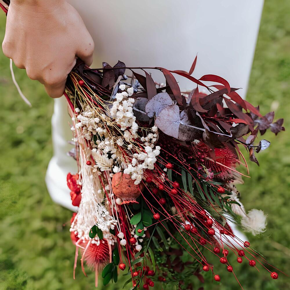 papaver - 2 ud. achillea - 3 ud. celosia - 3 ud. eucalipto - 3 ud. rosa preservada - 1 ud. astilbe pink - 3 ud. lino - 3 ud. silvestre secos y preservadas - 5 ud.