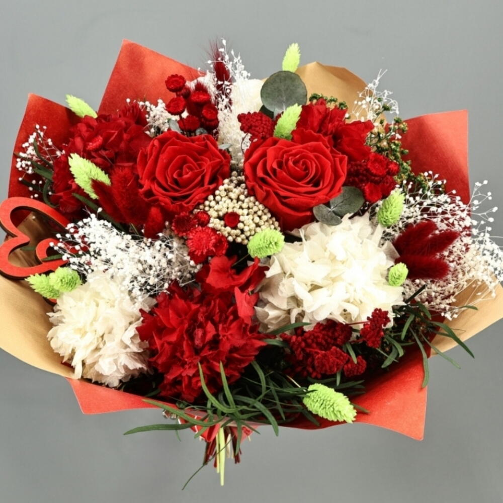 hortensia - 4 ud. eucalipto - 1 ud. broom - 2 ud. rosa preservada - 2 ud. flor de arroz - 1 ud.
