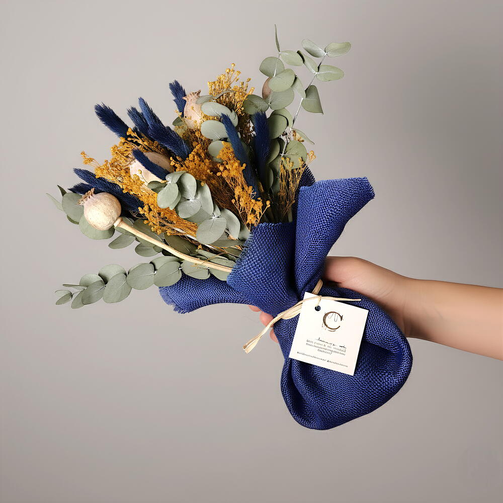 Este elegante ramo de flores preservadas combina tonos profundos y sofisticados que capturan la atención al instante. Los elementos en azul oscuro aportan un aire moderno y misterioso, mientras que los toques dorados añaden calidez y un brillo sutil. El follaje verde en tonos suaves equilibra la composición con frescura y naturalidad. Las texturas variadas de las flores secas crean un diseño único y lleno de carácter. La base envuelta en tela azul aporta un toque artesanal que realza aún más su belleza. Cada detalle ha sido cuidadosamente seleccionado para ofrecer un arreglo duradero y lleno de encanto. ¡Un detalle perfecto para decorar cualquier espacio con estilo y elegancia!