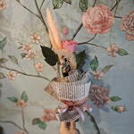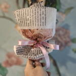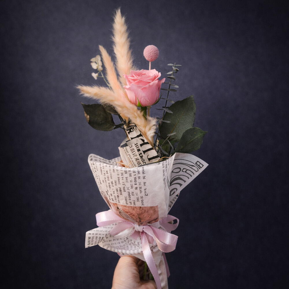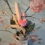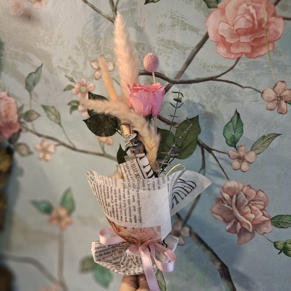 tarjeta dedicatoria - 1 ud. lazo de rafia - 1 ud. eucalipto baby blue preservado - 3 ud. pampas preservadas - 3 ud. hojas de rosa preservada - 3 ud. rosa eterna rosa claro - 1 ud. craspedia rosa preservada - 1 ud. papel seda blanco estampado - 1 ud.
