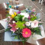 Gerbera - 2 ud. Gypsophila - 3 ud. protea - 1 ud. lirios - 1 ud. verdes variados - 15 ud. crisantemos - 6 ud. flores de relleno pequeñas (Wax flower) - 2 ud.