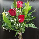 Este impresionante arreglo floral De Autor se compone de tres rosas rojas llamativas, dos delicados lirios y tres abundantes Paniculatas. Además, cuenta con tres variedades de verdes para añadir un toque de frescura natural. Este ramo encarna la armonía y el equilibrio perfectos entre la belleza y la elegancia. Un regalo perfecto para cualquier ocasión.