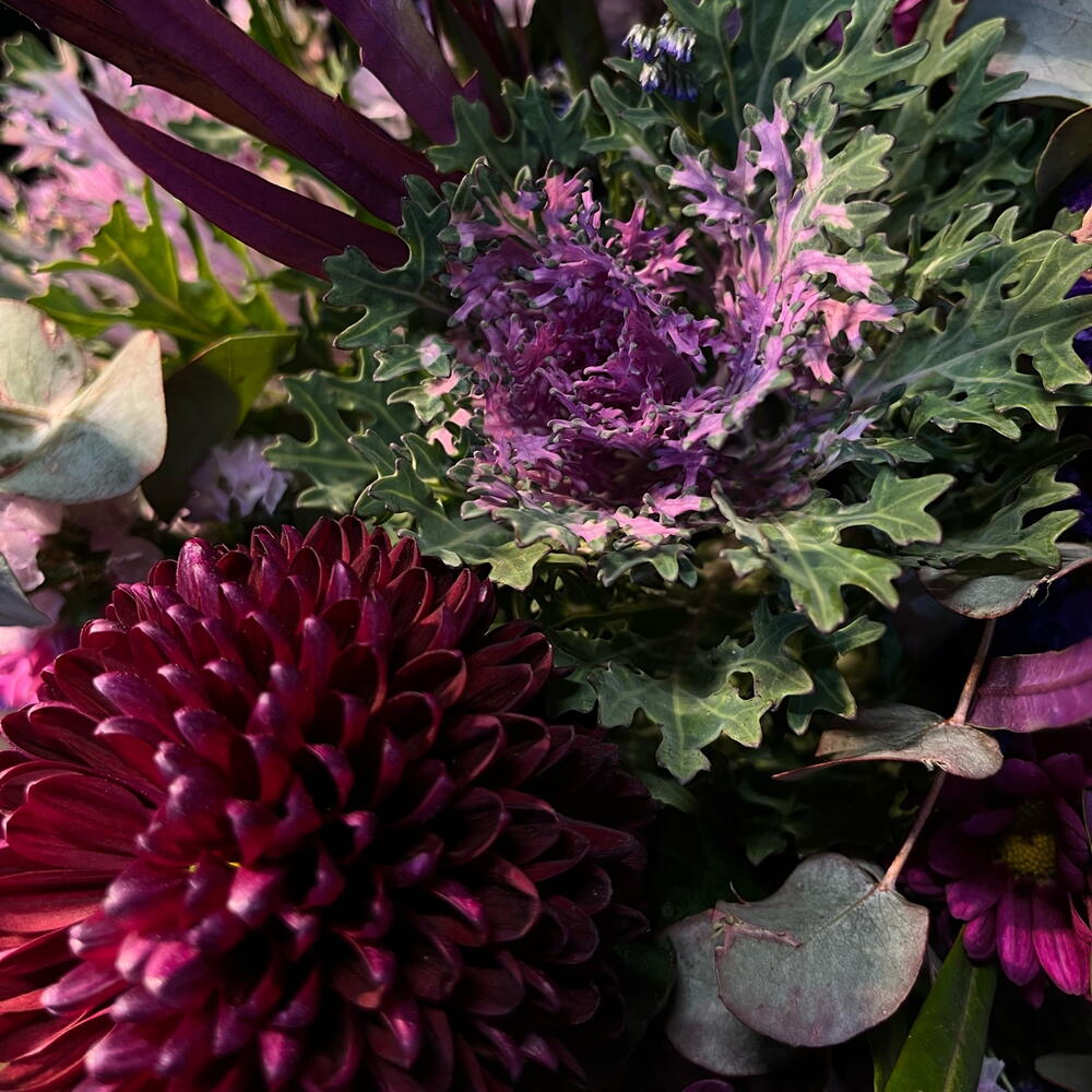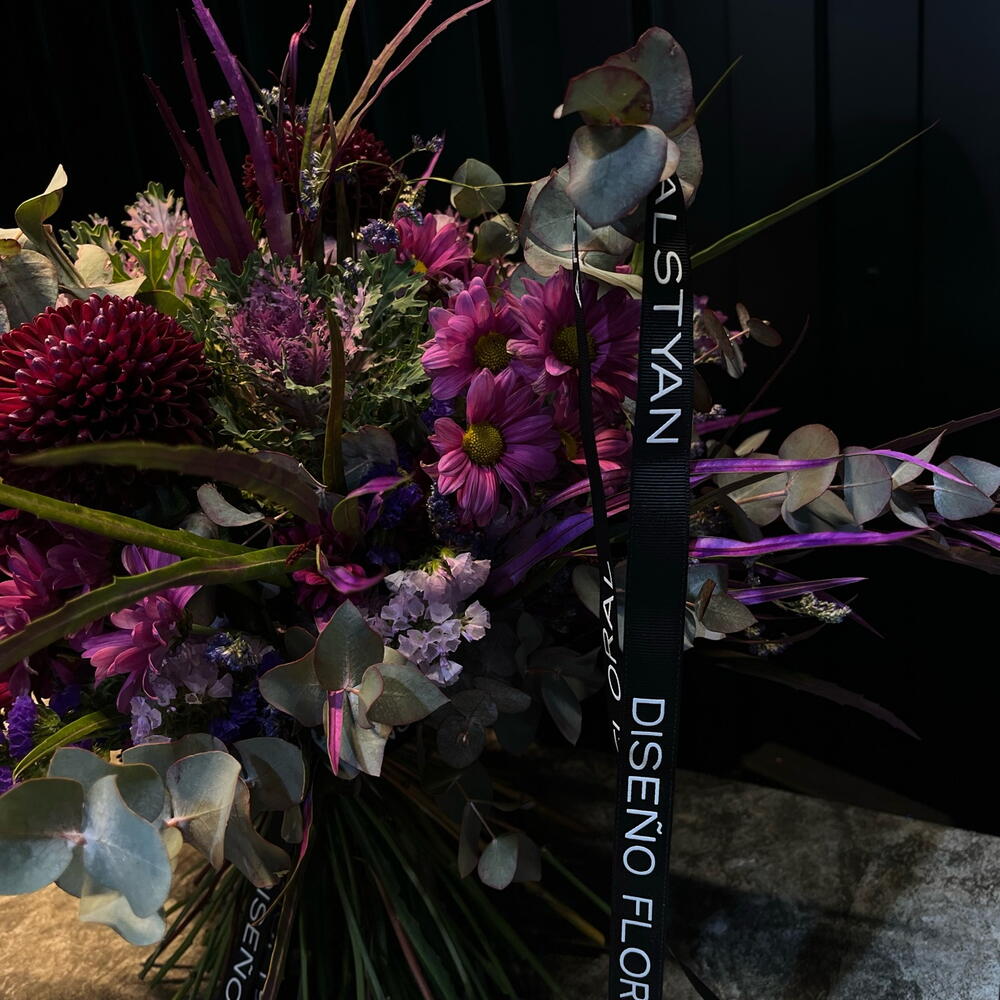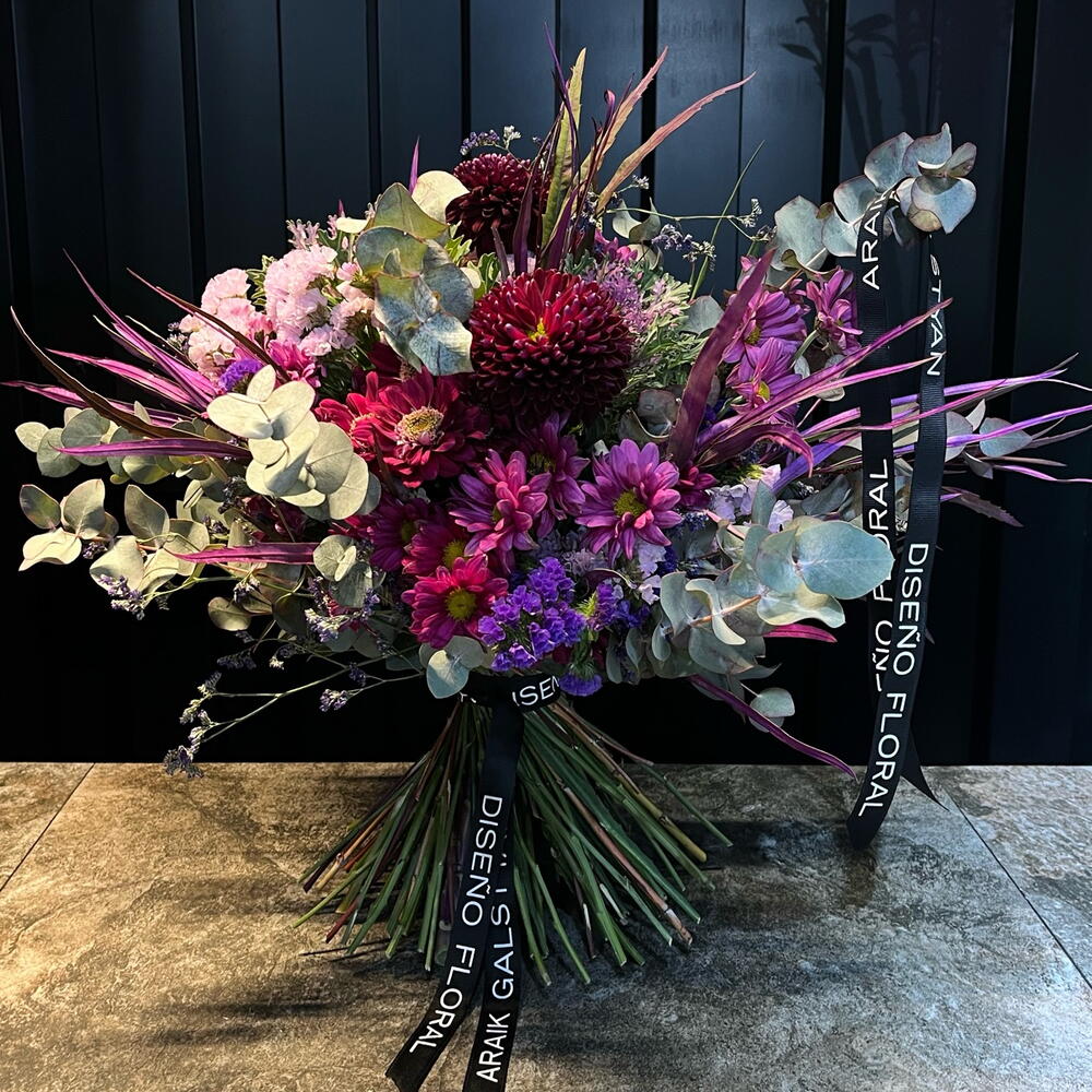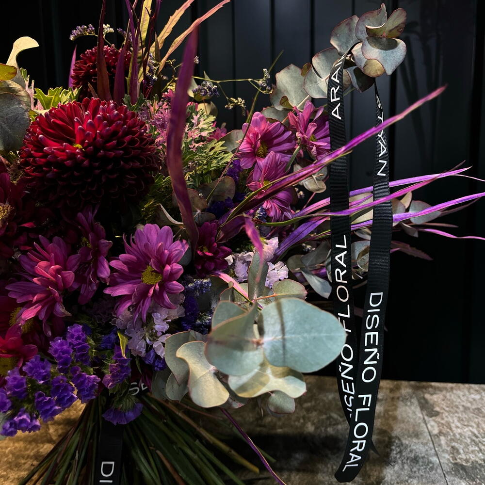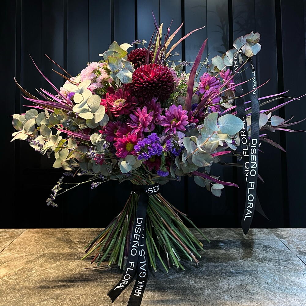 Statice - 10 ud. brassica purple - 3 ud. eucalipto cinerea - 2 ud. limonium purple - 2 ud. crisantemos - 5 ud.