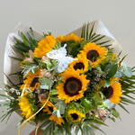 Limonium - 2 ud. girasoles - 9 ud. alstroemerias rosadas - 3 ud. verdes decorativos variados - 7 ud.