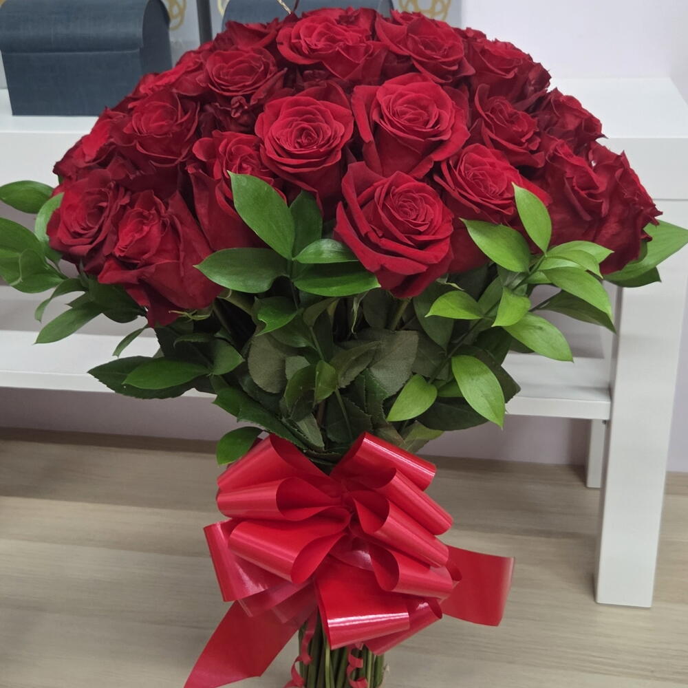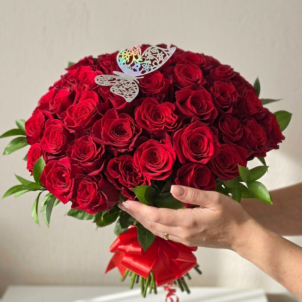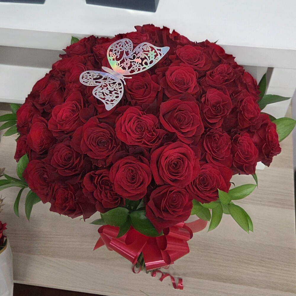 Ruscus - 10 ud. rosas rojas tallo largo - 50 ud. lazo decorativo - 1 ud. mariposas decorativas - 1 ud.
