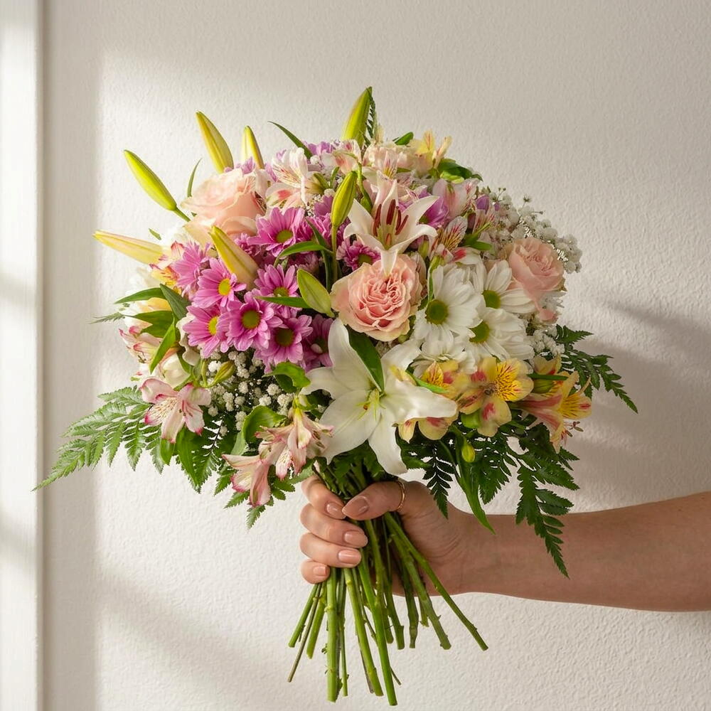 alstroemerias - 3 ud. paniculata - 5 ud. rosas rosadas - 4 ud. verdes variados - 8 ud. lirios blancos - 3 ud. crisantemos blancos - 3 ud. crisantemos rosados - 3 ud.