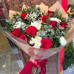 eucalipto cinerea - 1 ud. rosas rojas tallo largo - 9 ud. lentisco - 1 ud. limoniun - 1 ud. crisantemos blancos - 5 ud.