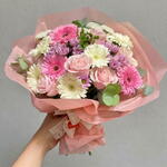 Un delicado y elegante ramo en tonos suaves que transmite ternura, alegría y frescura natural. La combinación de rosas rosadas, gerberas y crisantemos crea una armonía perfecta de colores pastel que iluminan cualquier momento especial. Cada flor aporta su propia textura y personalidad, formando una composición equilibrada y muy romántica. El toque de eucalipto y follaje verde añade frescura y un aroma suave que realza aún más la belleza del ramo. Su envoltorio en tonos rosados complementa la paleta floral y aporta un estilo delicado y moderno. Este bouquet es ideal para cumpleaños, agradecimientos, nacimientos o simplemente para alegrar el día de alguien especial. Para mantener el ramo fresco durante más tiempo, se recomienda cortar los tallos en diagonal antes de colocarlos en agua limpia, cambiar el agua cada dos días y retirar las hojas que queden sumergidas. Mantener el ramo en un lugar fresco, lejos de la luz solar directa, calefacción o corrientes de aire ayudará a prolongar la vida de las flores.